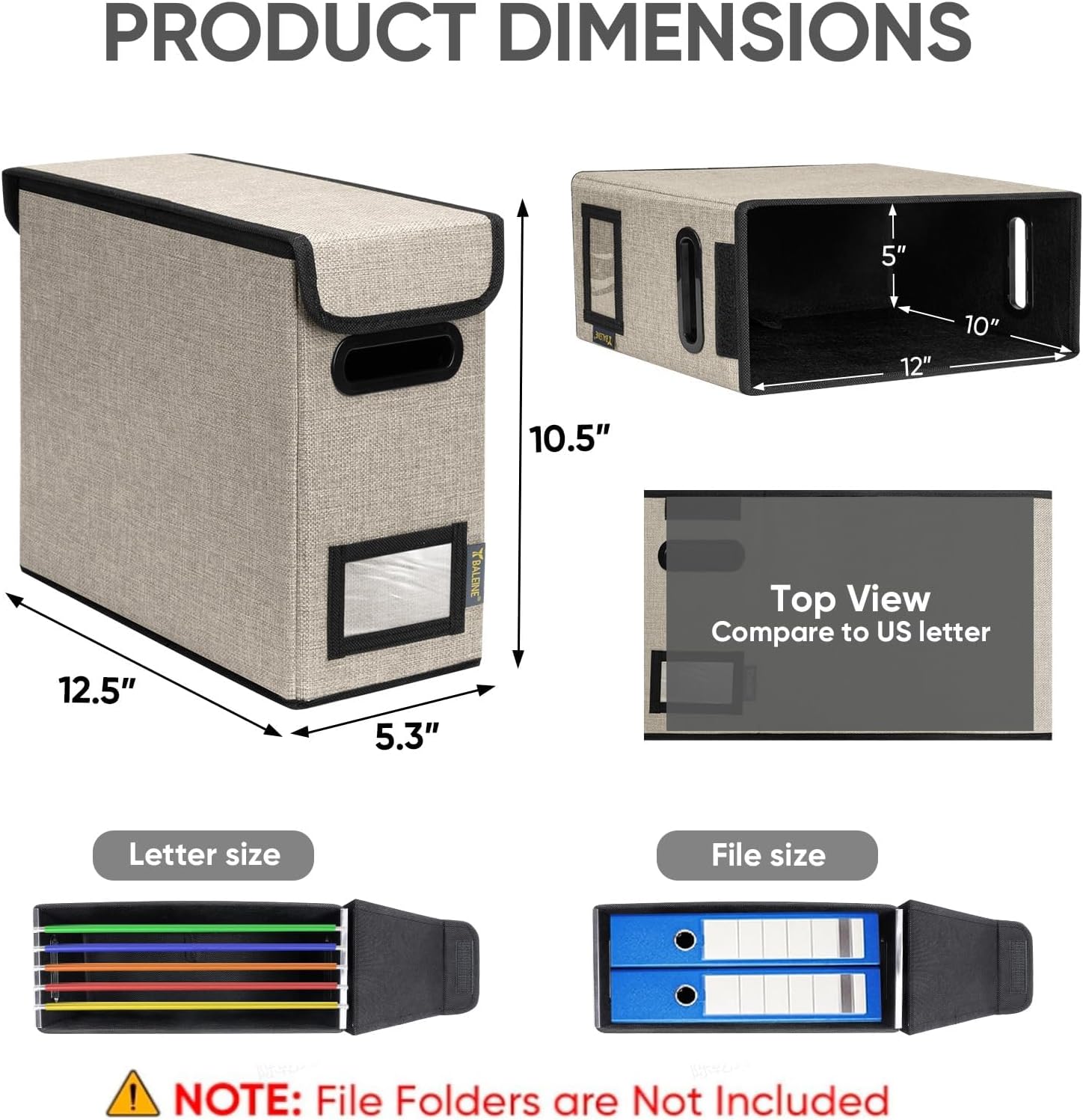 - [DURABLE MATERIAL] The outer layer of our filing box is crafted from high-quality polyester fabric and reinforced with thick cardboard in the middle. This construction ensures that the box maintains its shape and provides better bearing capacity for important documents and files. Its textured appearance can also serve as a stylish decorative element in any office or home
