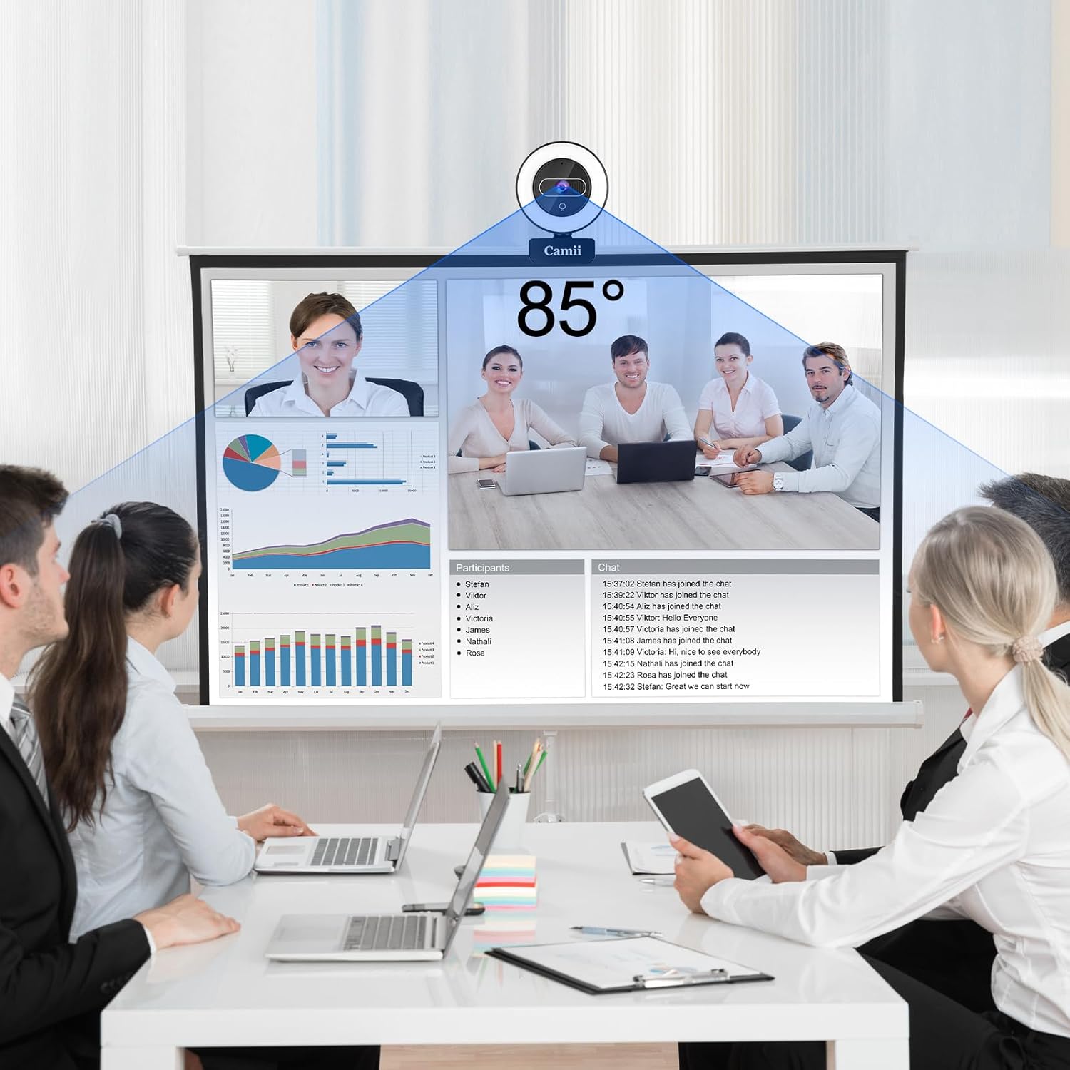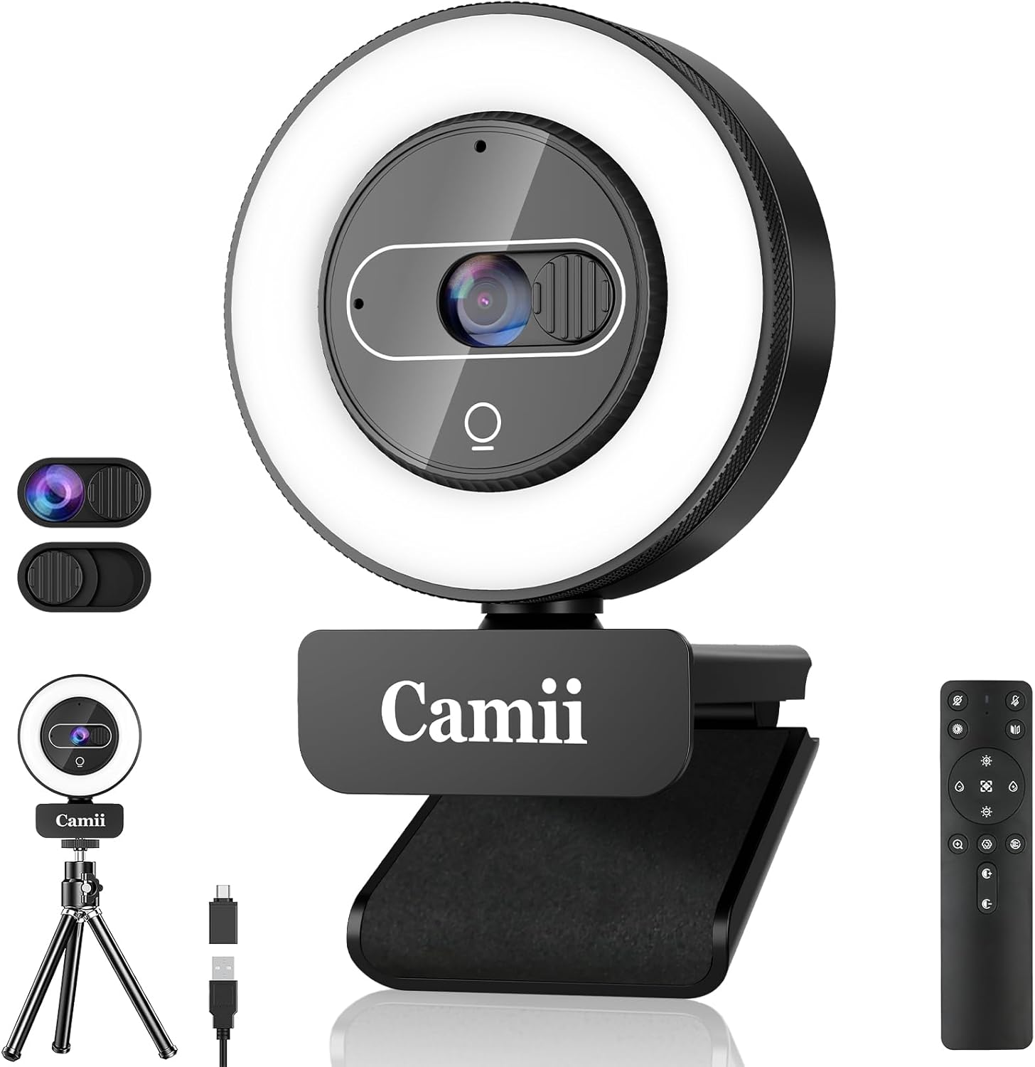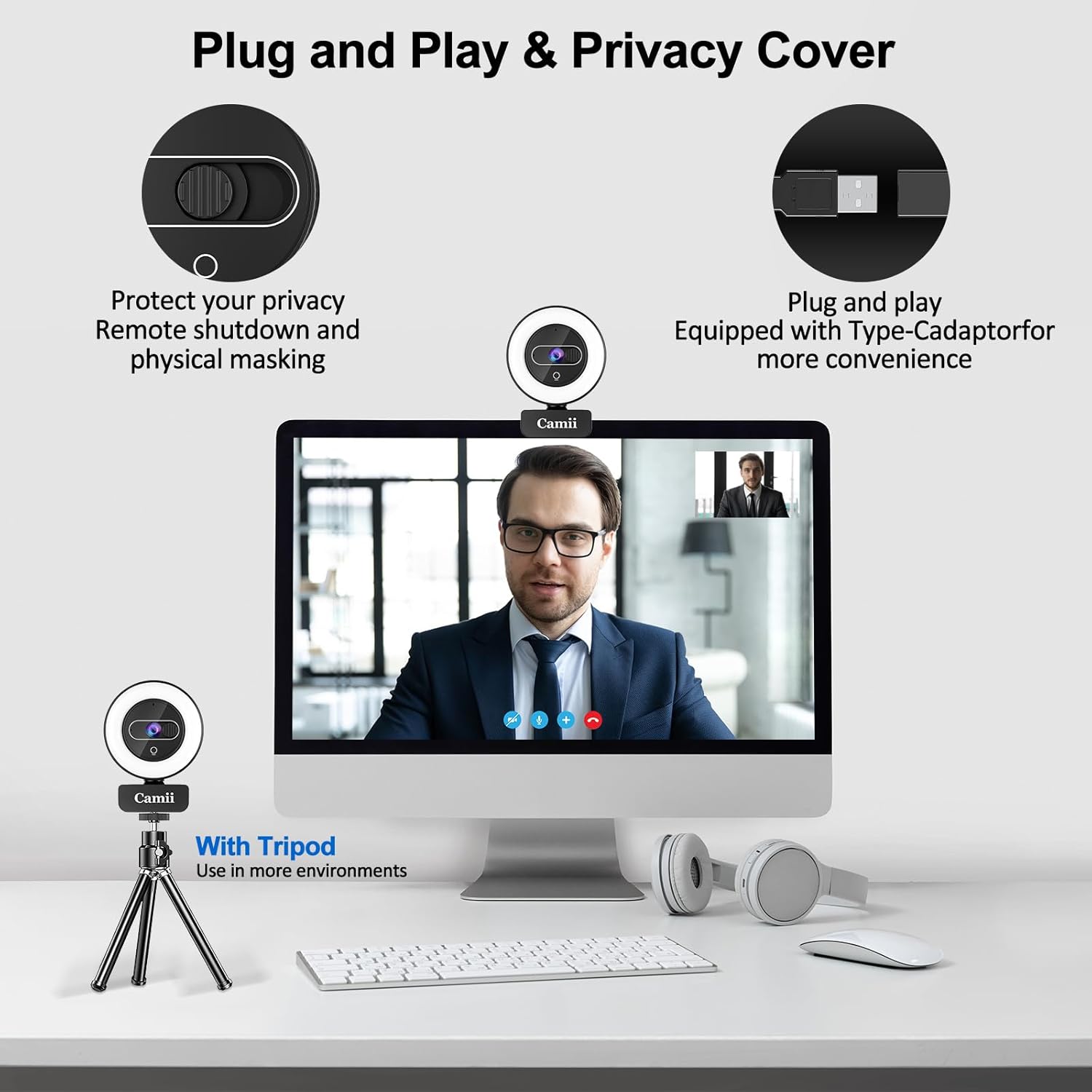 - [Dual Microphone and Privacy Shutter]: The webcam with light has a built-in noise-cancelling microphone to reduce ambient noisy interference and make calls smooth and stable, and the dual microphone income sound effect brings a clear human voice experience. With built-in privacy cover and remote video disable function, webcam with microphone is designed to provide users with better privacy protection, you can enjoy a safe digital internet life even when you are not using it, preventing hackers from intruding.