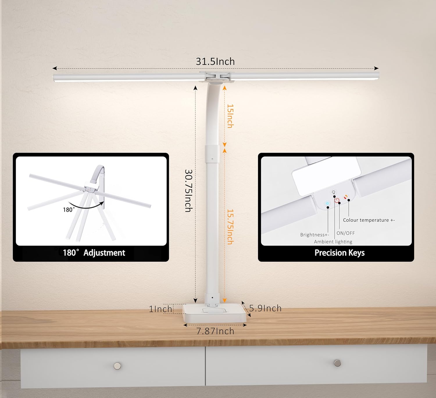- 【Super Wide, Large and Bright】 This 24W LED desk lamp has a double head design that allows you to adjust the angle of the light bar. It can extend to 31.5 inches and fully illuminates the table. Suitable for multi-monitor workstation, home office, large desk, study, architect, computer, drawing, sewing, crafts, painting, reading, gaming, piano. Height up to 32.7 inches. The best LED desk lamp for working from home