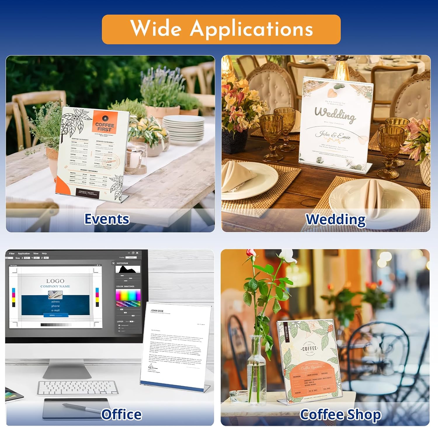 - 【Easy to Change Paper】No need to remove the frame from the base of acrylic sign holder, it is convenient for allowing the quick and simple insertion and removal of picture from our display stand with opening on the sides, So it enhances efficiency and productivity by saving valuable time.
