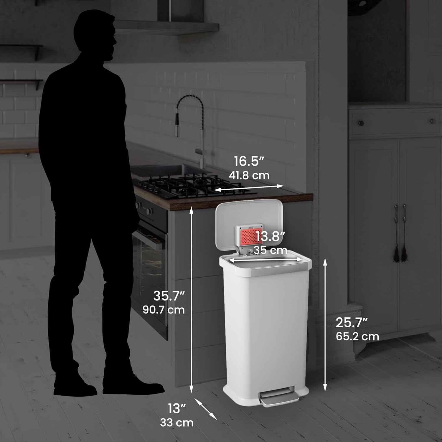 iTouchless SoftStep 13.2 Gal / 50L Step Pedal Kitchen Trash Can with Odor Filter, Durable Dent-Proof Construction and Stainless Steel Trim, Garbage Bin with Lid for Home Office, Bedroom, White Plastic