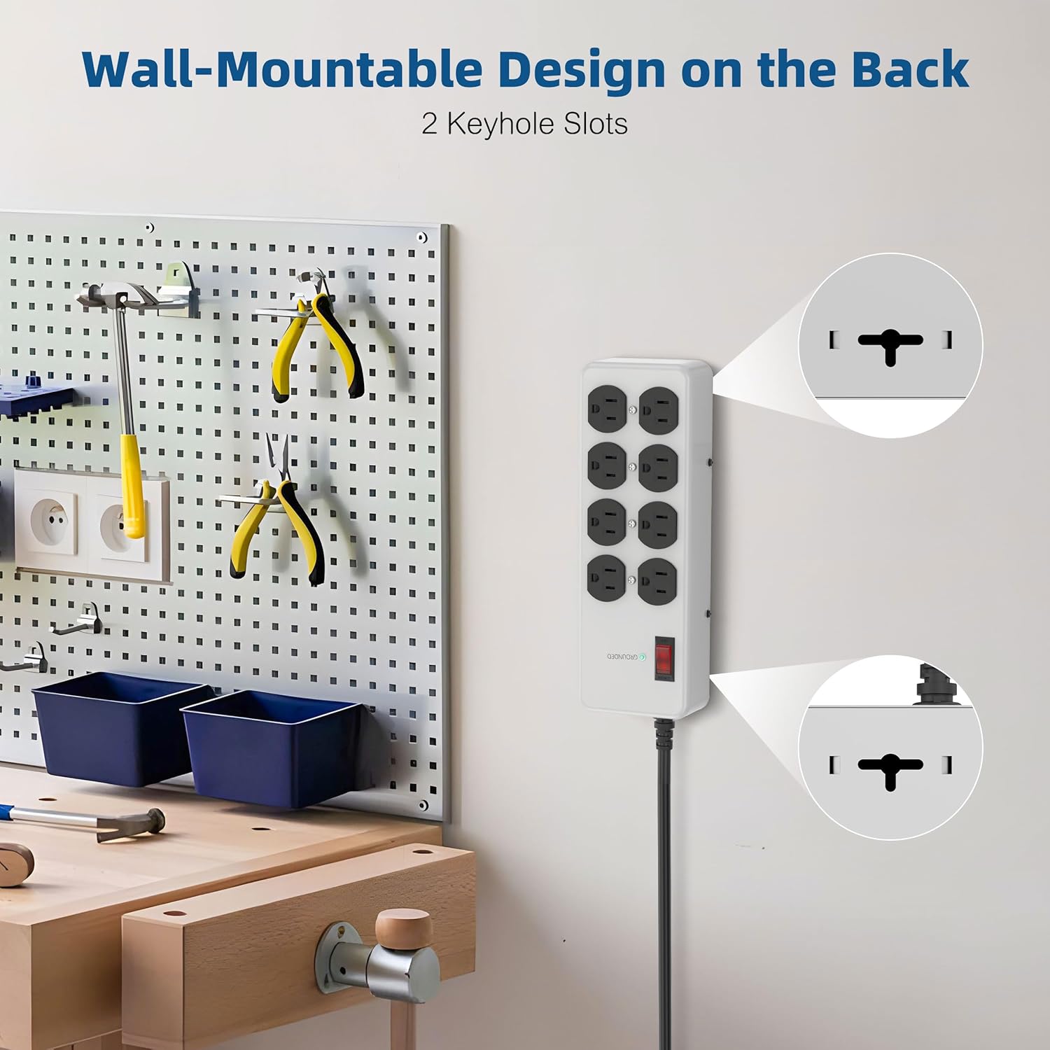 - High Capacity Powering: Equipped with 8 AC Outlets, this tool power strip surge protector has an electrical rating of 15A 125V 60Hz 1875W, combined with a 6ft 14AWG Heavy Duty Power Cord. It's the ultimate solution for all your power needs in heavy-duty settings, embodying the essence of a shop power strip heavy duty 15 amp.