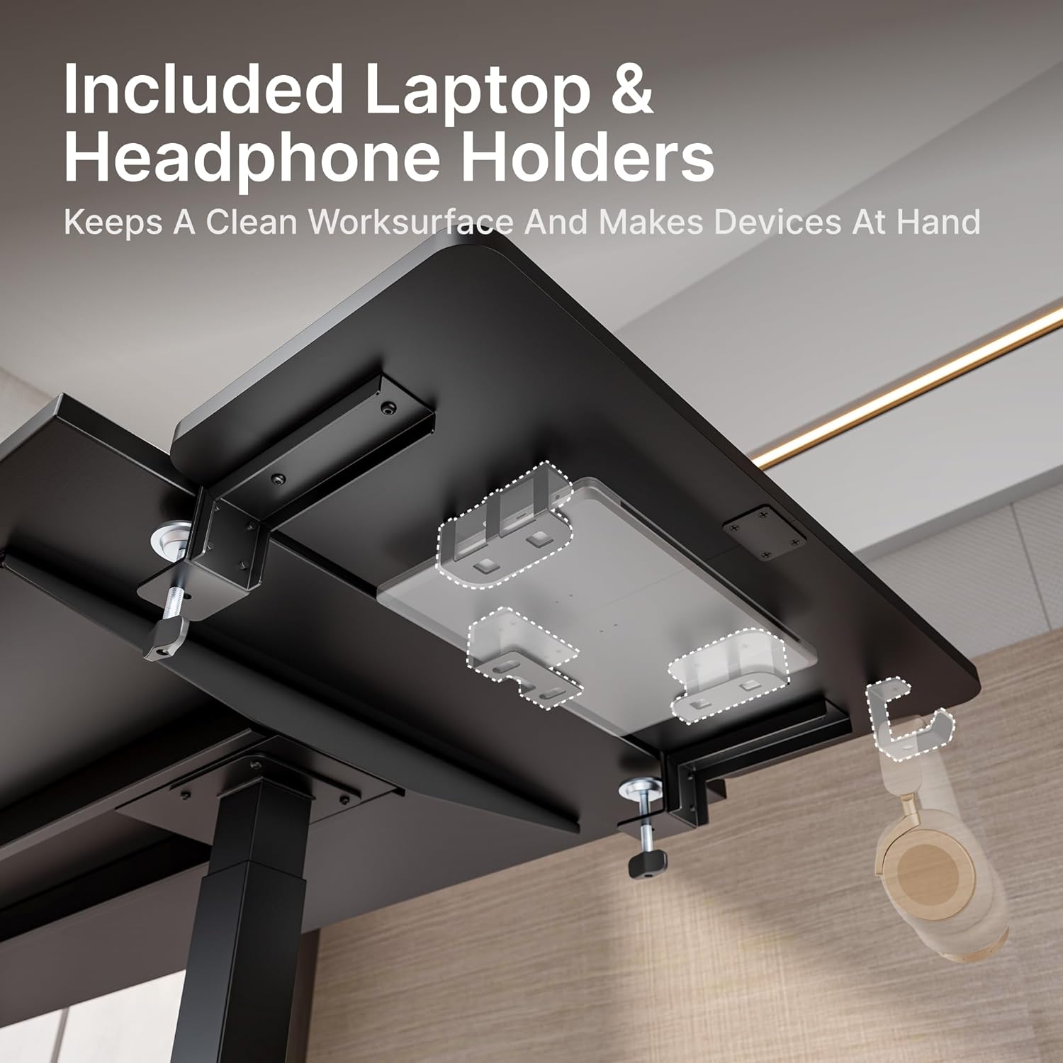 - INTEGRATED LAPTOP AND HEADPHONE HOLDER: Maximize efficiency with the thoughtfully designed bottom that includes a laptop stand and headphone hook. These additional storage options help keep your workspace tidy and free from clutter.