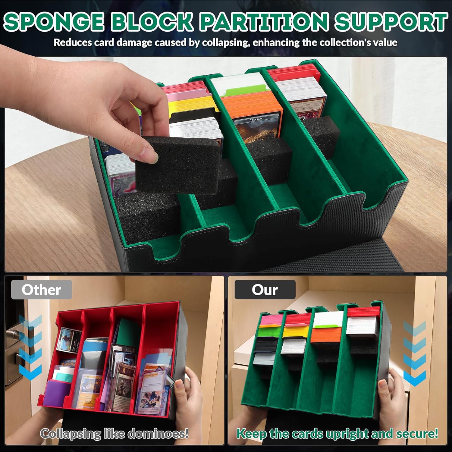 - ๐๐๐ฅ๐ฅ-๐๐๐ฌ๐ข๐ ๐ง๐๐ - Our TCG card storage box set elegantly showcases cards while ensuring organized storage. The included 4 foam stoppers allow the cards to stand upright even when the box is not fully filled, keeping them secure and preventing warping, accidental movement, or damage.