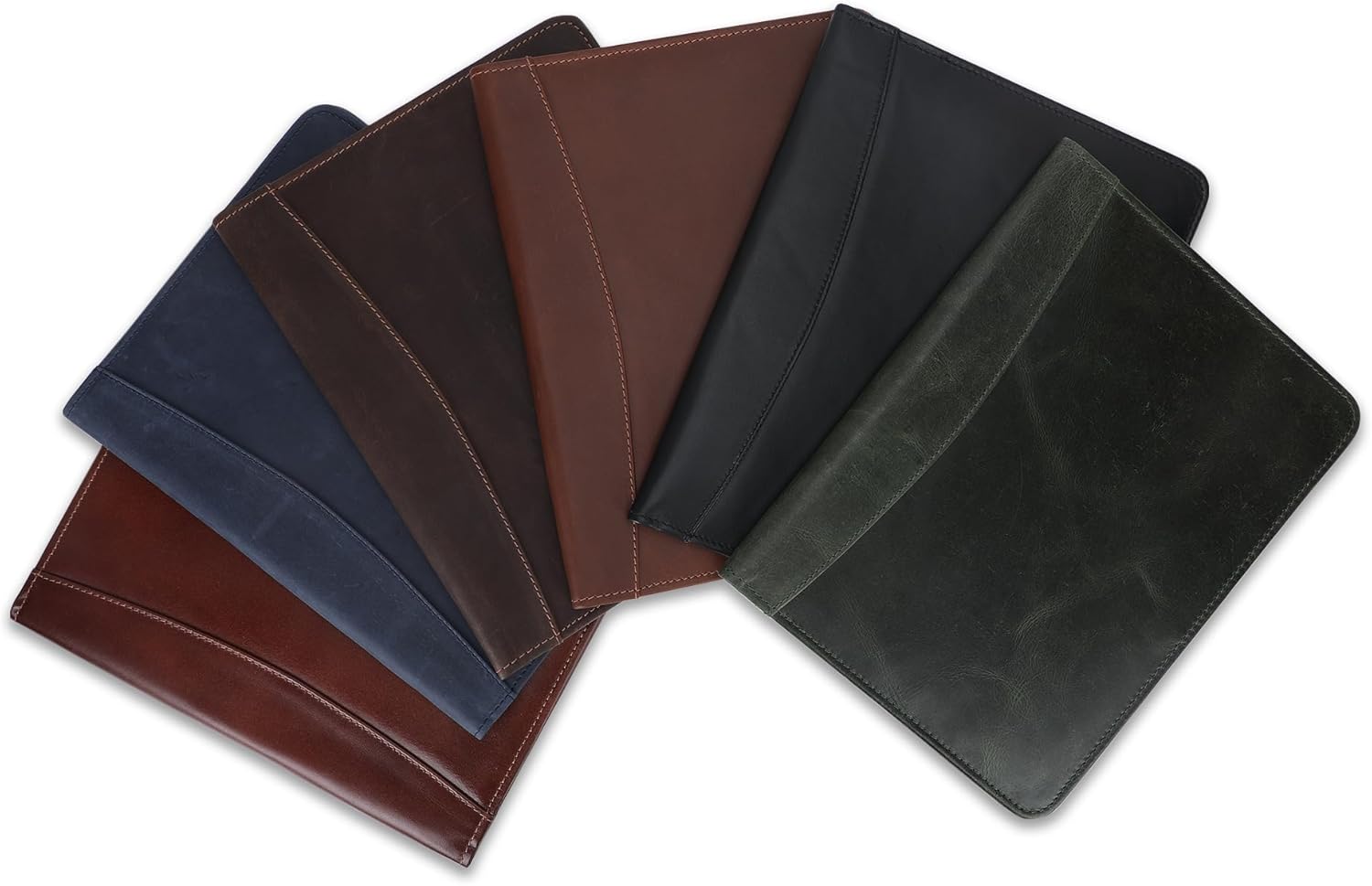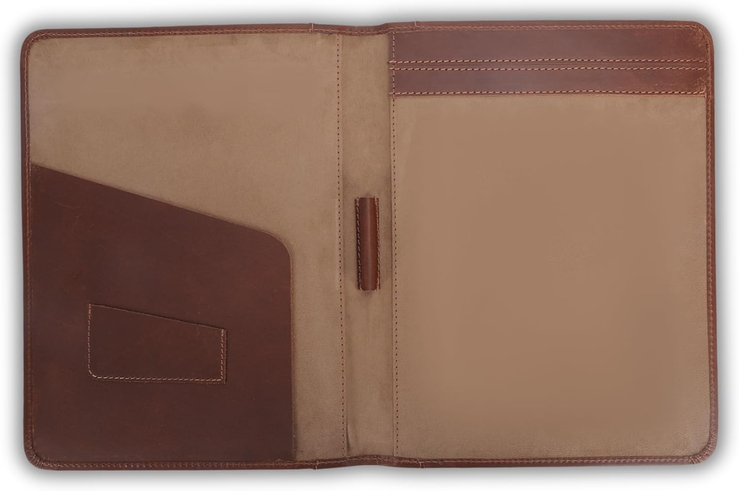- PERFECT STORAGE - Leather folder with the size of 13” x 10”, give you a plenty of storage. A sleeve holder perfect for the legal pad writing pads and A4 notepads & paper sheet, 1 pen slot, 1 wave-shaped business card holder and 1 side pockets for documents. This wonderful leather notepad construct without annoying zipper will organize your paper stuff very well. And what is more, it will add your confidence and great first impression definitely.