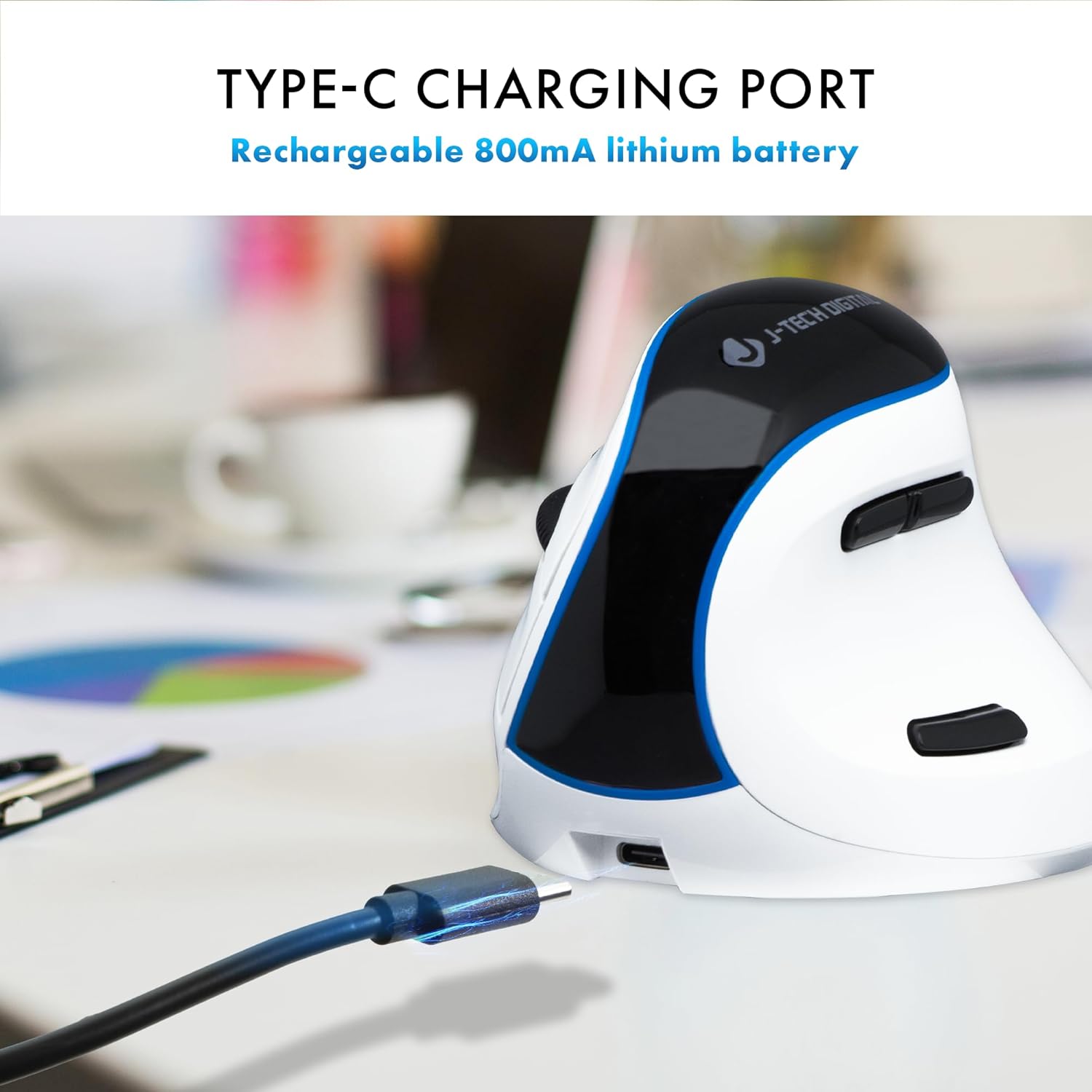 J-Tech Digital Wireless Mouse, Vertical Ergonomic Mouse with Bluetooth Dual Modes + USB Dongle + Rechargeable w/ 2.4GHz Wireless + Adjustable DPI 3200 for Laptop, Desktop, PC, Mac [V638W], White