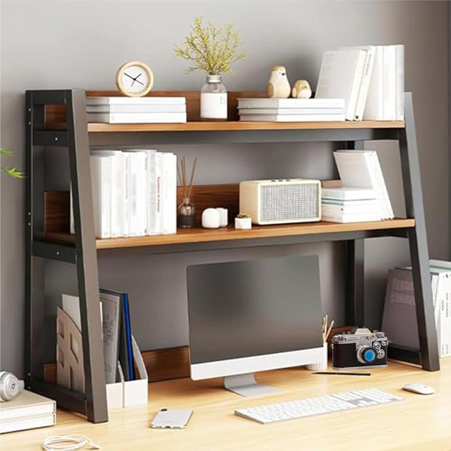 - 【Abundant Storage】2-layer multifunctional countertop storage rack with ladder-shaped frame design, narrow at the top and wide at the bottom, which can greatly save desktop space. Can be used as a computer desk storage rack to store books, office supplies, A4 documents, etc. It can also be used as a home display stand to store photo frames, calendars, decorations, ornaments, etc.