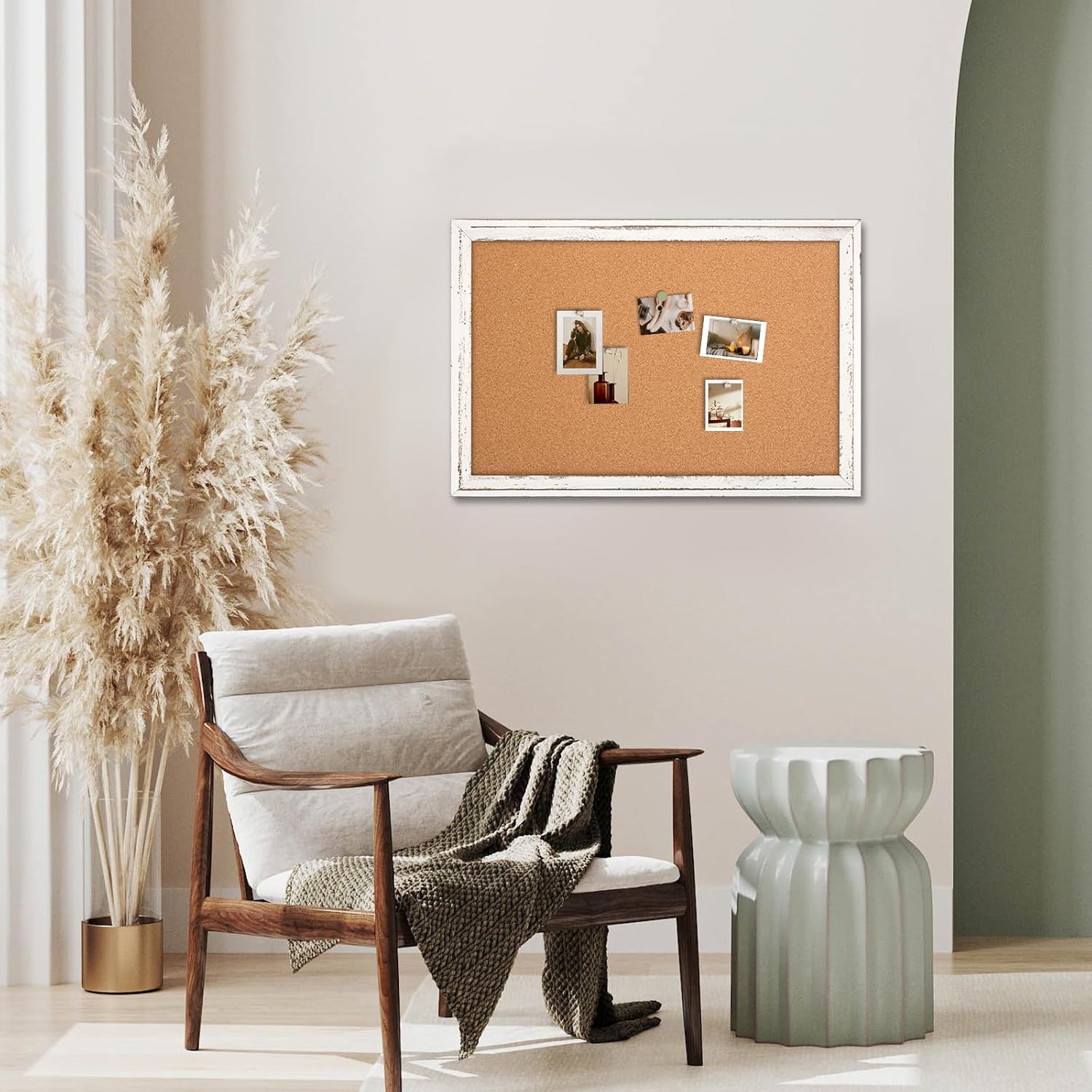 Cork Board Bulletin Board, 30" x 20" Rustic White Wooden Frame Corkboard for Wall, Hanging Vision Board, Pin Board for Home Room Dorm Office Decor