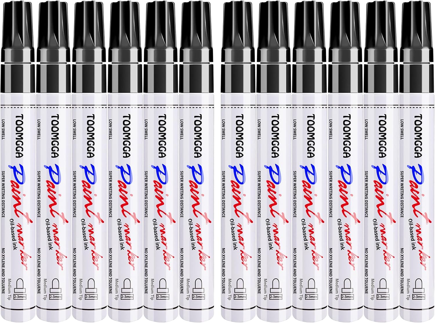 Black Paint Pens Permanent Paint Markers - 12 Pack Oil Based Marking Pens, Medium Point, Quick Drying and Waterproof for Rock Painting Car Tyre Metal, Plastic, Canvas, Wood