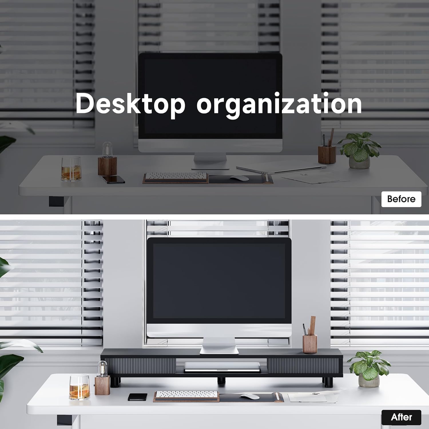 - 【Space Optimization】: Experience effortless desk organization with our monitor stand, 2-tier storage space, 42.5 inches long monitor stand, 3 high capacity compartments, and a convenient sliding drawer, and cable management openings. Streamline your workspace and make your work a breeze