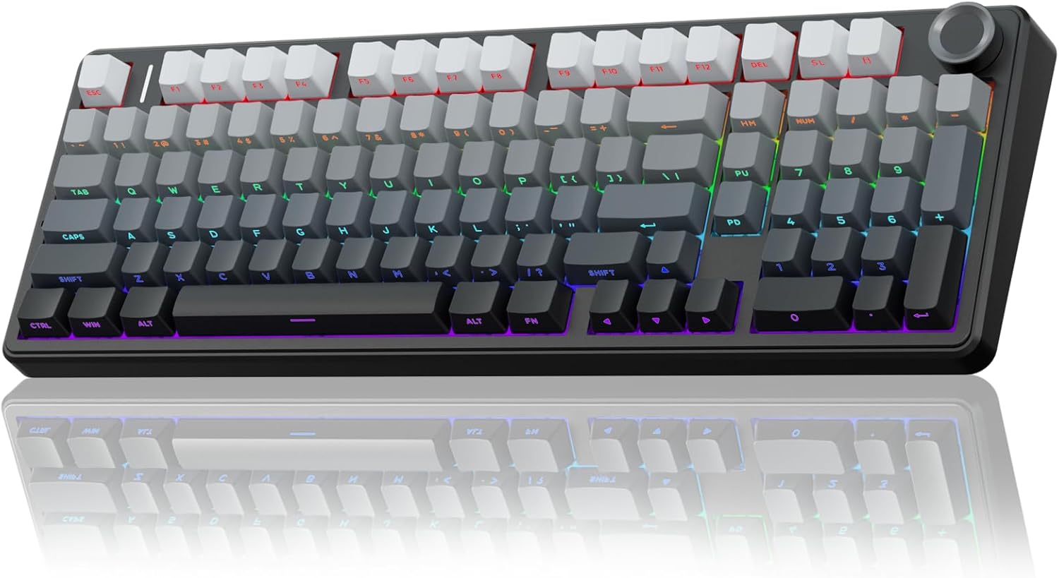 - PBT Keycaps and 8000mAh Battery: 99 keys 96% layout compact keyboard can save more desktop space while keep necessary arrow keys and number area for games and work. The rechargeable keyboard built-in 8000mAh large capcacity battery to provide more power and longer battery life. Double shot PBT keycaps, made from two colors material molded into each others, make the keycaps characters maintain the vibrance and saturation, clear and not fade