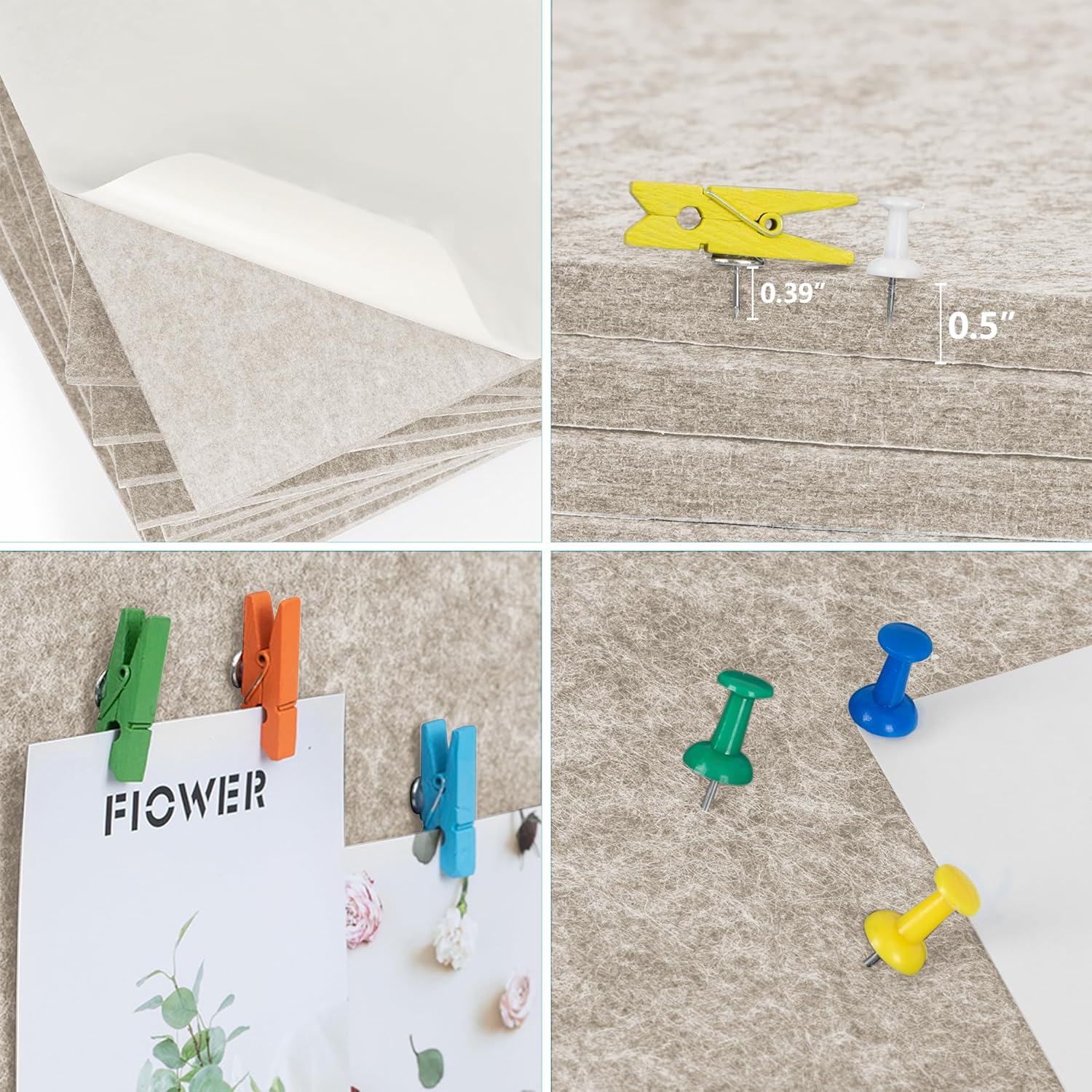 AKTOP Cork Bulletin Board 12x12, 1/2" Thick Felt Cork Board Tiles 6 Pack, Small Square Pin Board for Wall, Self Adhesive Corkboards with 60 Push Pin Wood Clips for School, Home & Office, Latte
