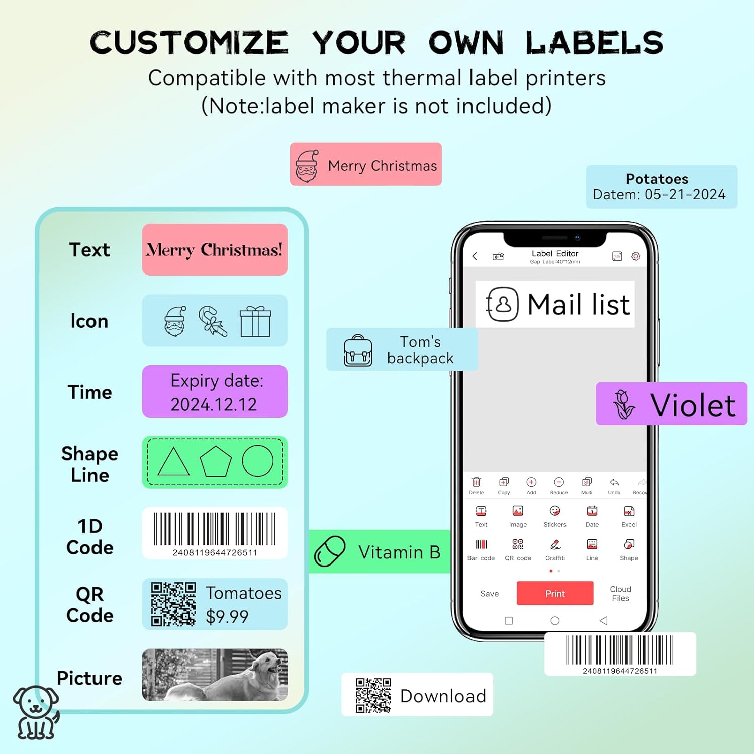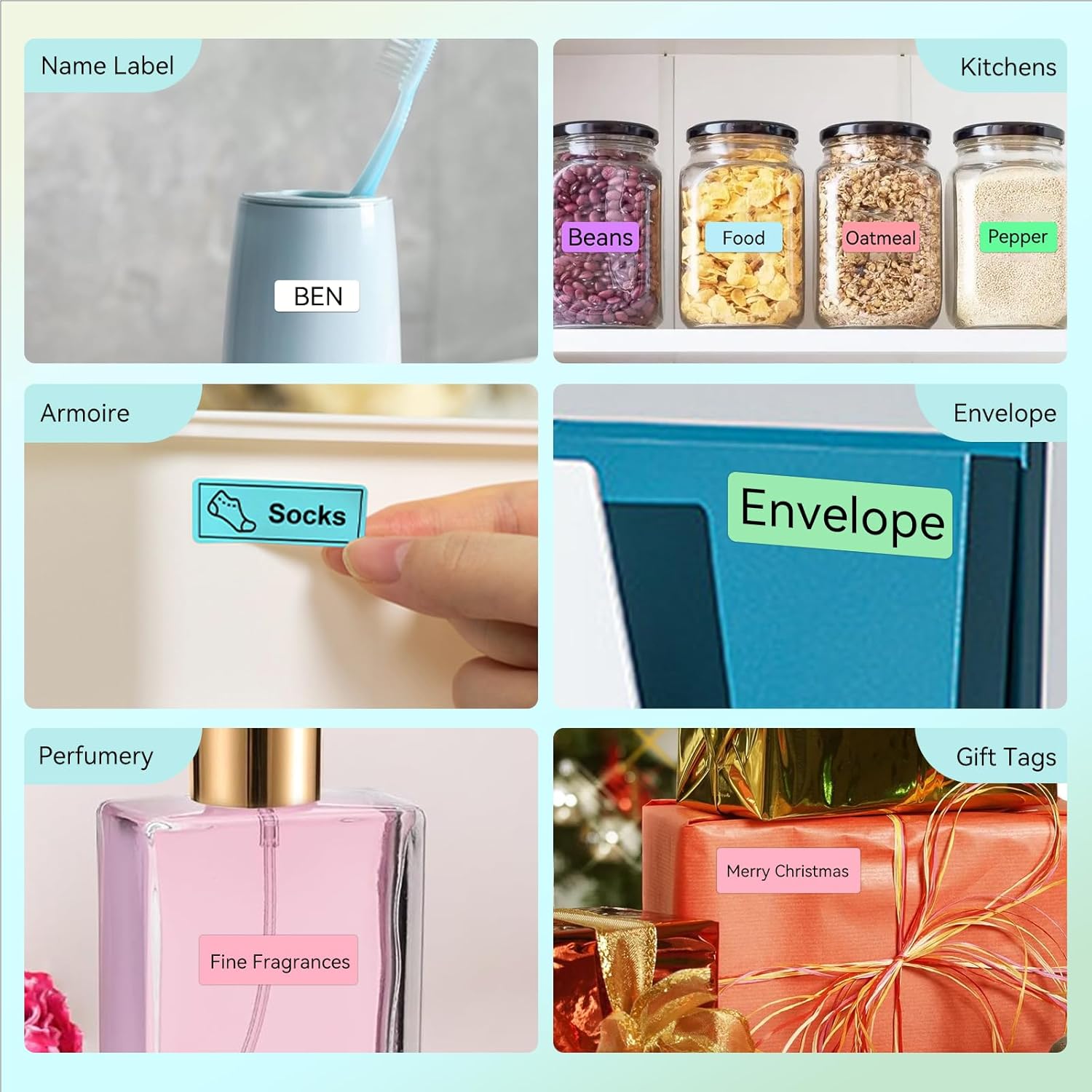 - Label Maker Tape — You could get 10 rolls of labels in total, with sizes 12x40mm (0.47"x1.57"), 165 labels/roll, and 1650pcs in total. 2 Rolls white, 2 Rolls pink, 2 Rolls blue, 2 Rolls green and 2 Rolls purple.