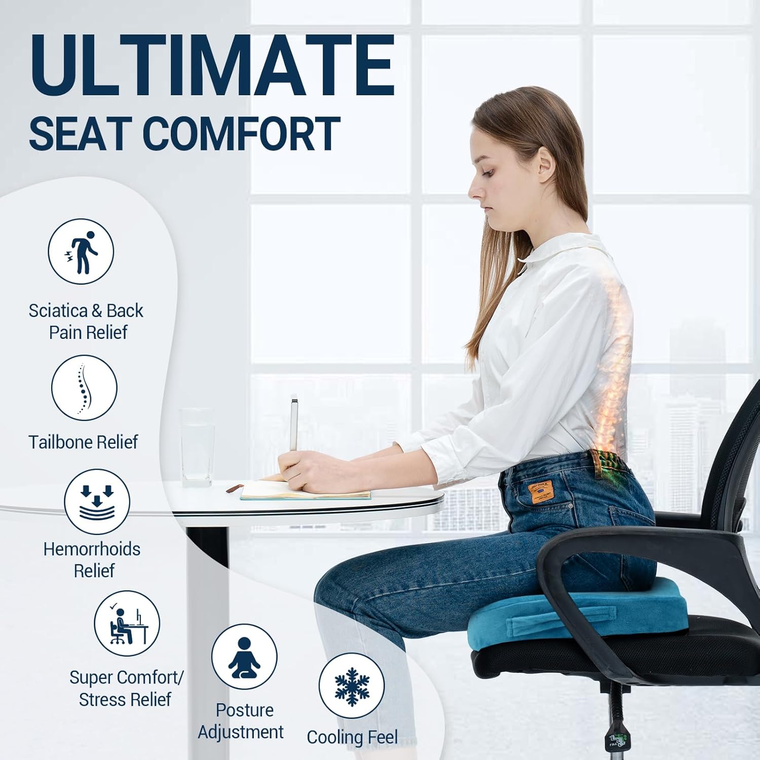 - Ultimate Comfort & Support for All-Day Sitting: Our seat pads features a premium combination of memory foam and cooling gel, designed to offer unparalleled comfort. The ergonomic design contours perfectly to your body, ensuring a natural alignment of the spine and providing optimal support to relieve pressure on the tailbone and lower back. Whether you're sitting at a desk, in the car, or traveling, this cushion supports long hours of sitting with ease.