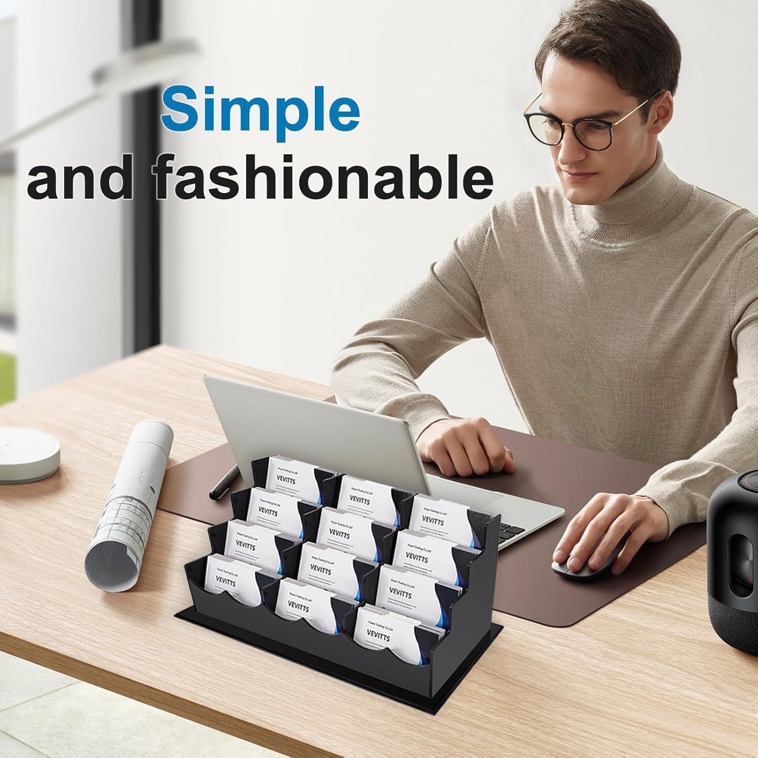 - Perfect Size: This black business card display rack is 12.6 x 5.5 x 5.1in (32 x 14 x 13cm) and features 12 individual slots for horizontal cards. Each slot can hold approximately 50 cards.