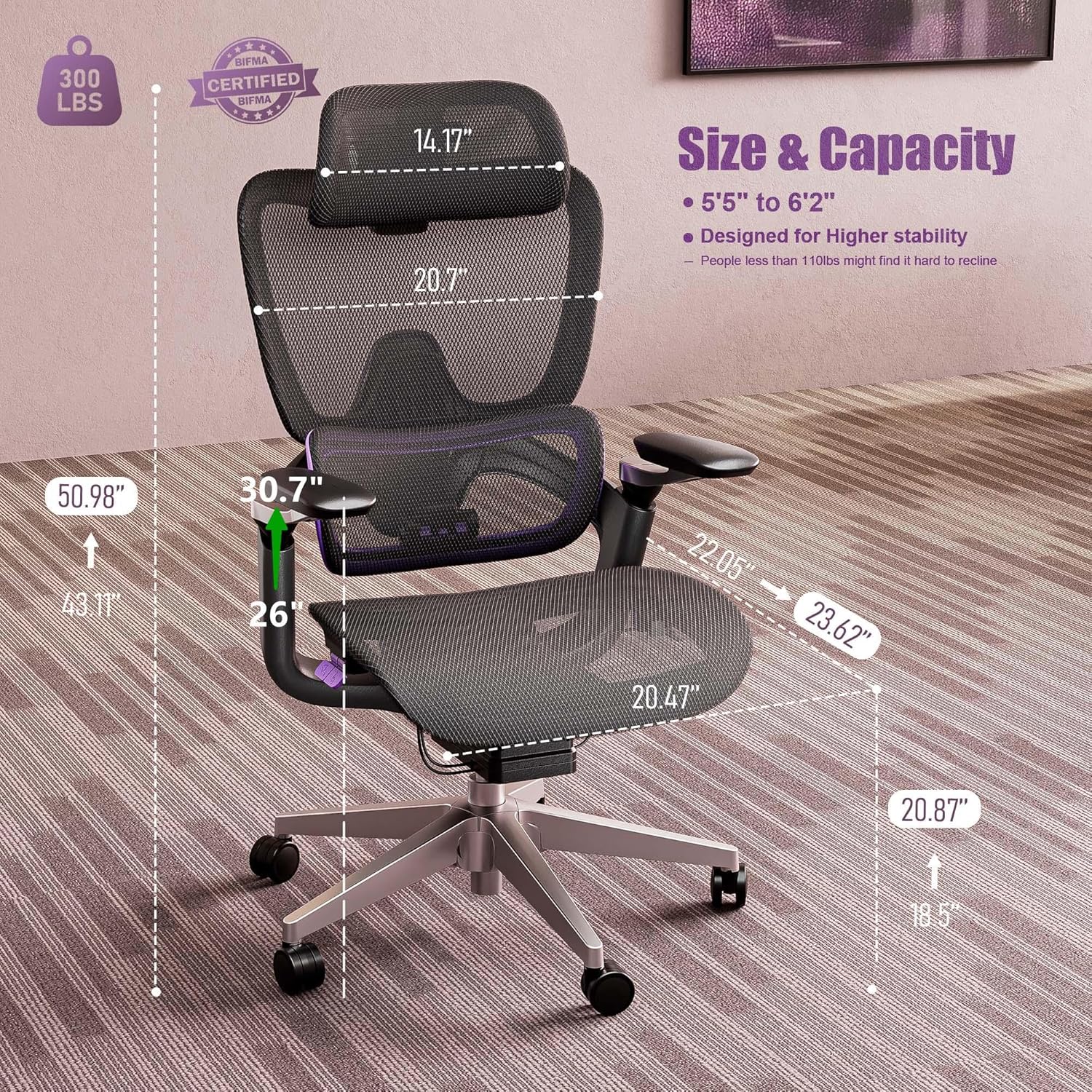 Ergonomic Office Chair, Mesh Home Office Desk Chair with Adjustable Lumbar Support, Big and Tall Gaming Chair with 4D Headrest, 5D Armrest,90-130°Tilt, BIFMA Certified, Model Zen (Purple)
