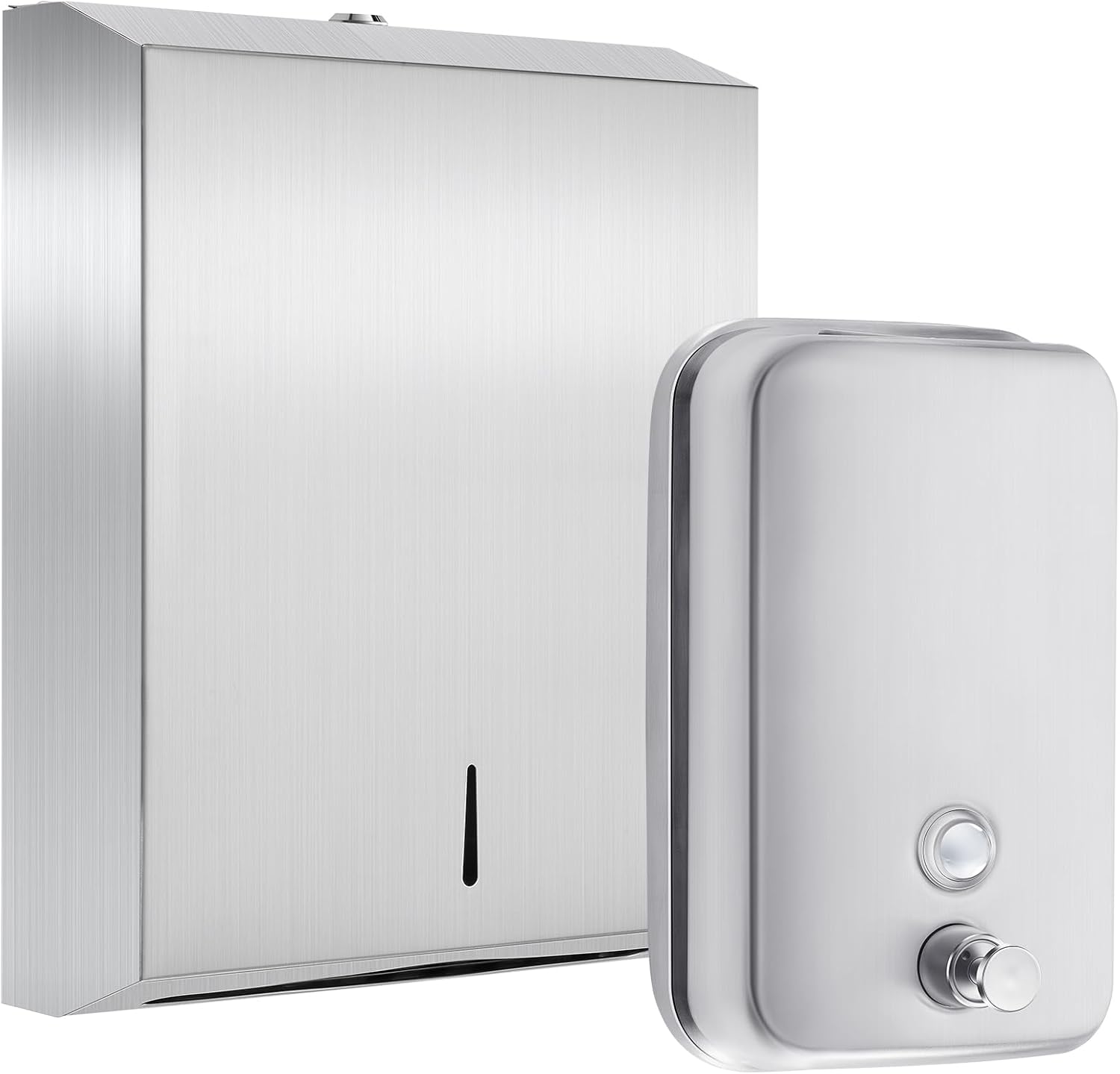 2 Pcs Commercial Soap Dispenser and Paper Towel Dispenser Set with Lock-Stainless Steel,Wall Mount,Large Capacity Manual Liquid Pump Rust Proof Leak Free for Commercial Home Bathroom