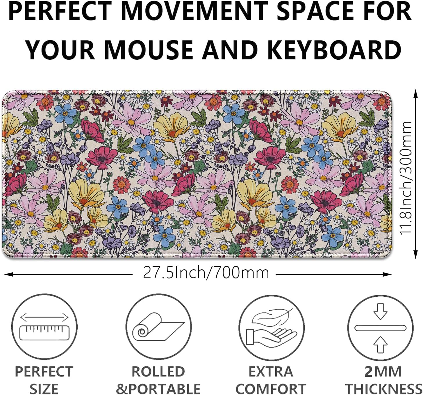 Colorful Flowers Mouse Pad,Large Floral Mousepad Desk Pad with Stitched Edges,Non-Slip Waterproof Rubber Base Mouse Mat for Office Computer Keyboard Laptop Home(27.5x11.8 in)