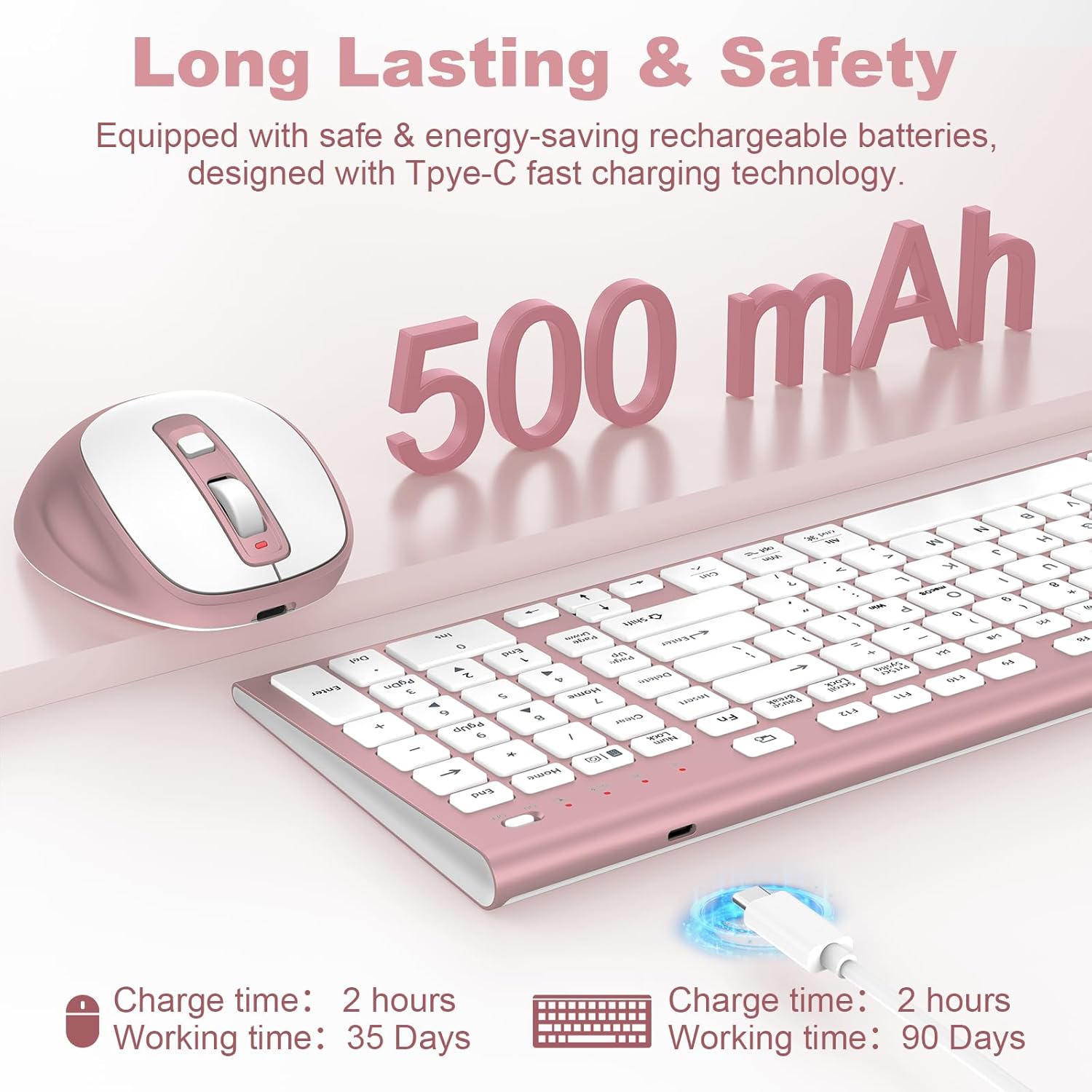 FENIFOX Wireless Keyboard and Mouse, Ergonomic Rechargeable Silent Quiet Slim Compact Full-Size USB C with Number Pad Flat Soft Cover for PC Computer Laptop Mac MacBook iMac Windows - Pink Rose Gold
