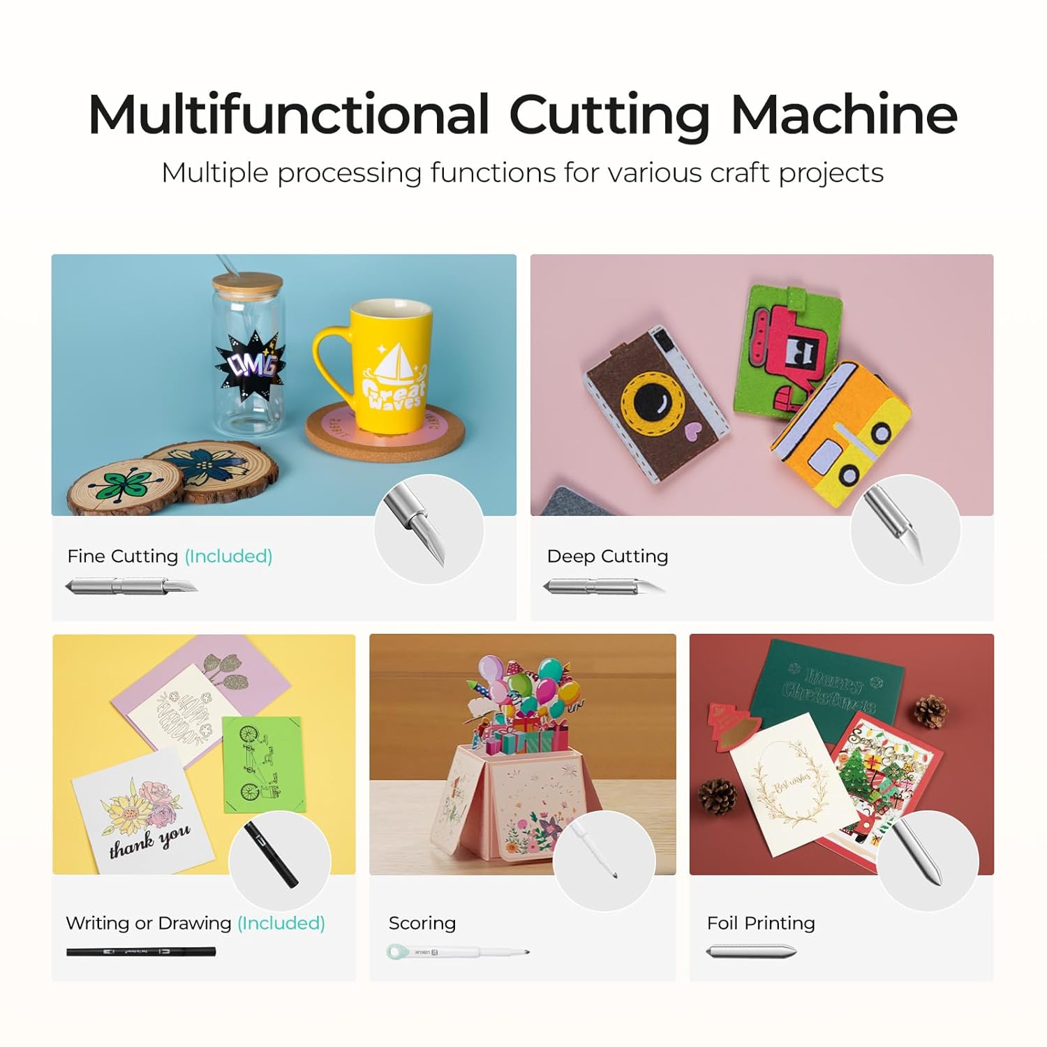 - 5 IN 1 MULTI-FUNCTION: Not only has fine-cutting, writing or drawing functions (tools included), this vinyl cutter machine also compatible with deep cutting, scoring and foil printing (tools sold separately). Whether you’re customizing t-shirts, making intricate cards, scrapbook pages, personalizing 3D boxes, or creating home decor, this machine can truly meet your craft needs and unlimited creativity