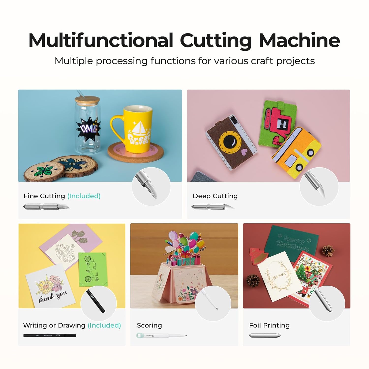 - 5 IN 1 MULTI-FUNCTION: Not only has fine-cutting, writing or drawing functions (tools included), this vinyl cutter machine also compatible with deep cutting, scoring and foil printing (tools sold separately). Whether you’re customizing t-shirts, making intricate cards, scrapbook pages, personalizing 3D boxes, or creating home decor, this machine can truly meet your craft needs and unlimited creativity