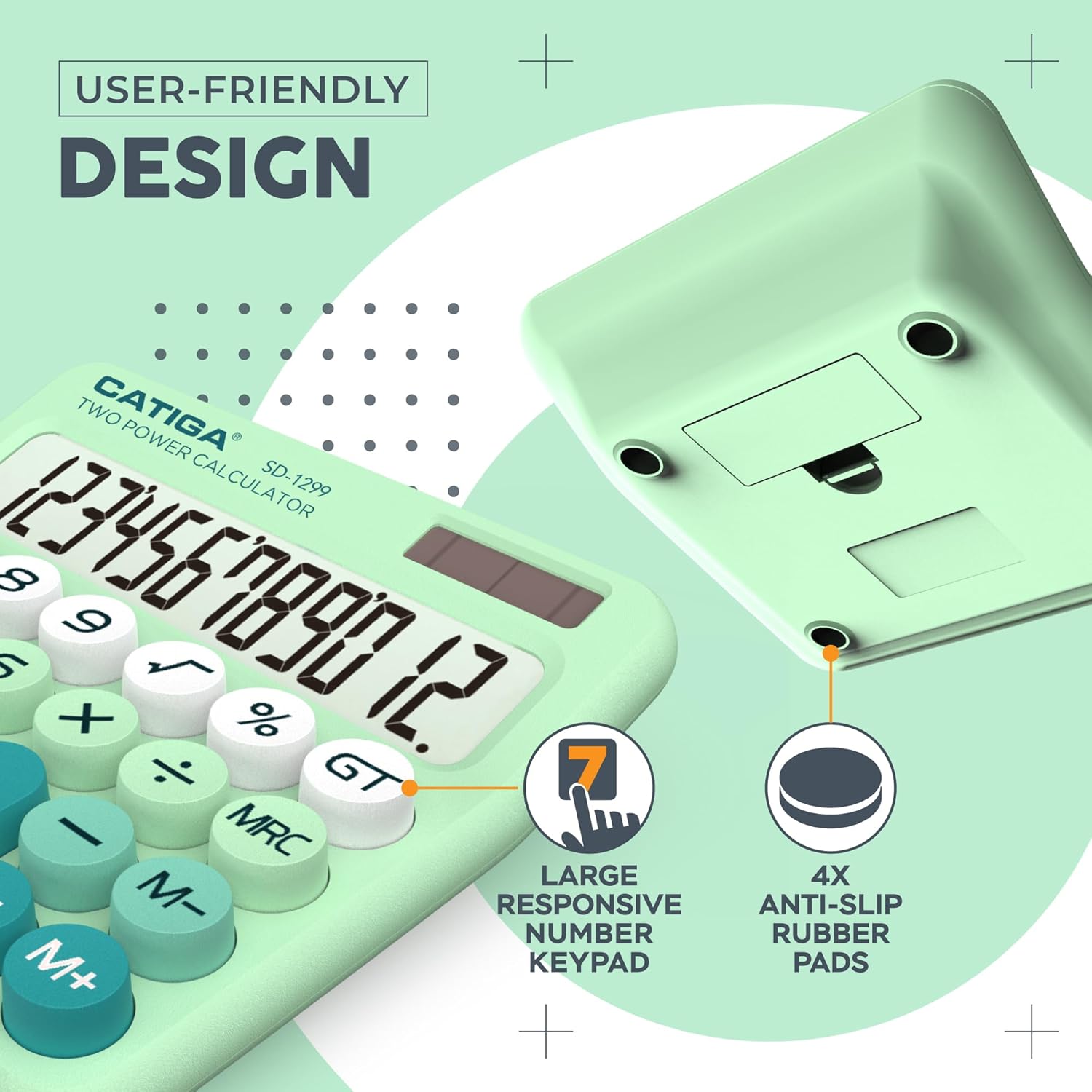 CATIGA Mechanical Switch Calculator with Solar and Battery Dual Power, 12-Digit Large LCD Display, Aesthetic and Cute Desktop Calculator with Big Button, for Home, School and Office Use, SD-1299