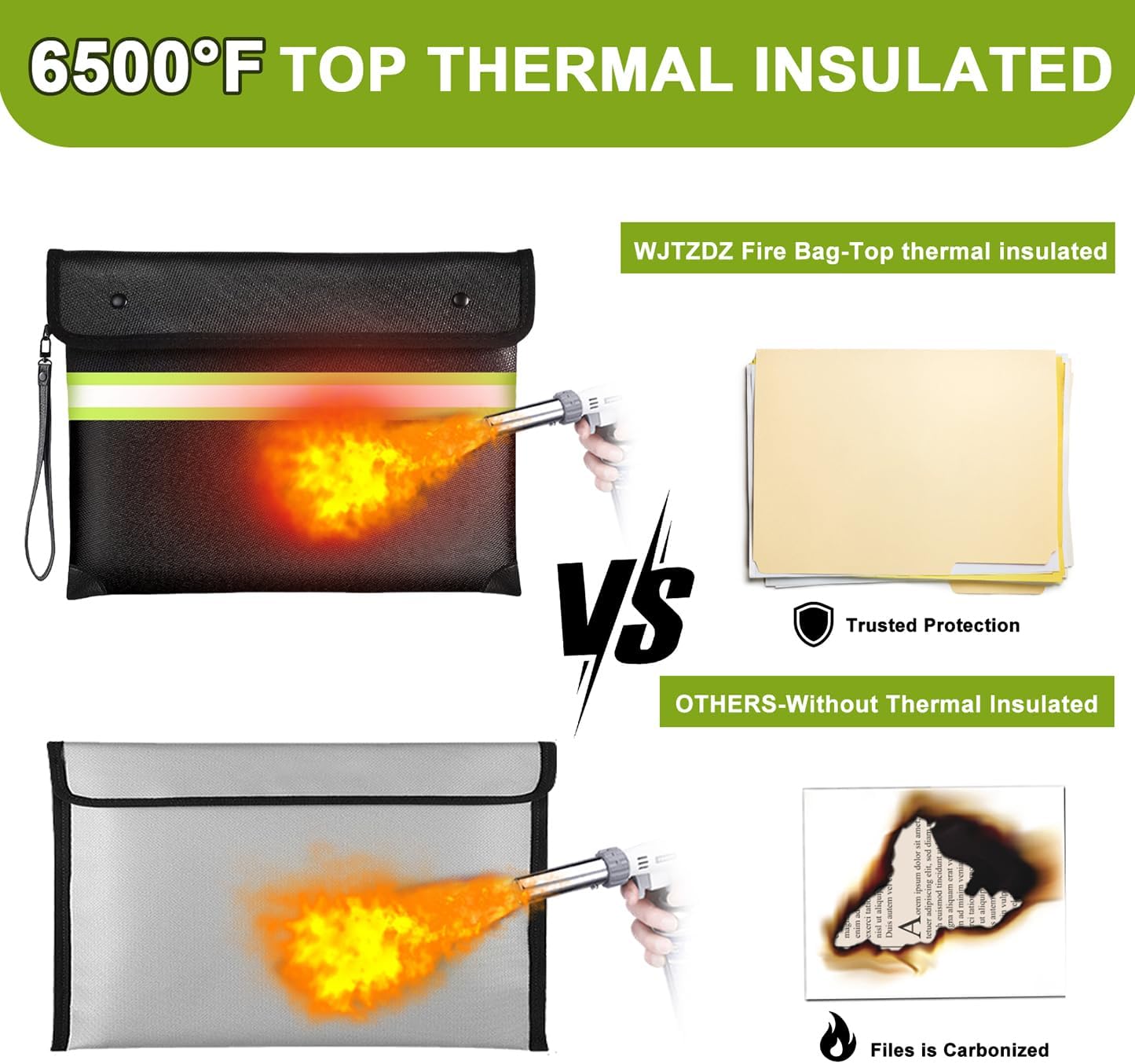- ⚠️(Note) Fireproof does not mean it can withstand a long fire, and waterproof does not mean it can be immersed in water for a long time.It just gives you enough time to rescue your valuables. 🔥【6500°F Top Fireproof】The upgraded fireproof bag has passed the global flammability standard (US laboratory) and vertical burning test (SGS UL94 V-1) and can withstand temperatures up to 6500°F, far exceeding the typical fire temperature.