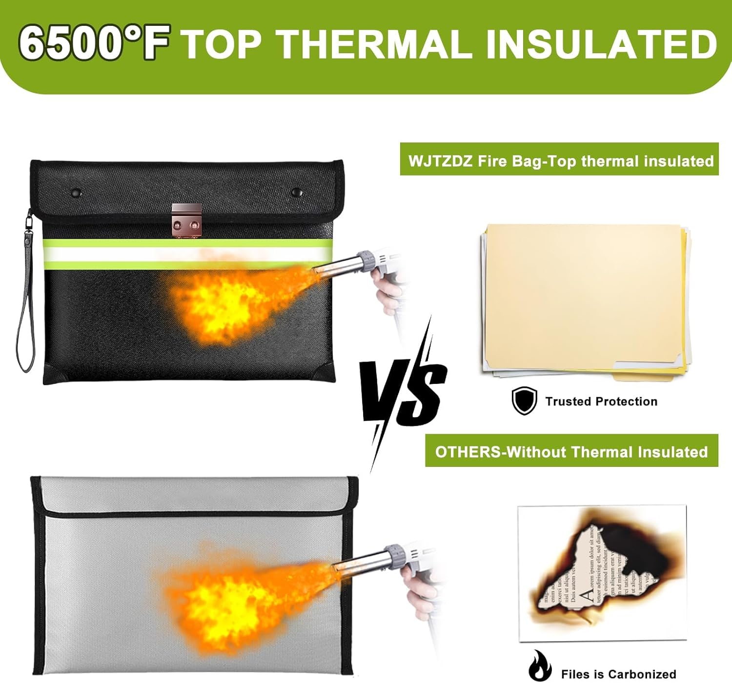 - ⚠️(Note) Fireproof does not mean it can withstand a long fire, and waterproof does not mean it can be immersed in water for a long time.It just gives you enough time to rescue your valuables. 🔥【6500°F Top Fireproof】The upgraded fireproof bag has passed the global flammability standard (US laboratory) and vertical burning test (SGS UL94 V-1) and can withstand temperatures up to 6500°F, far exceeding the typical fire temperature.