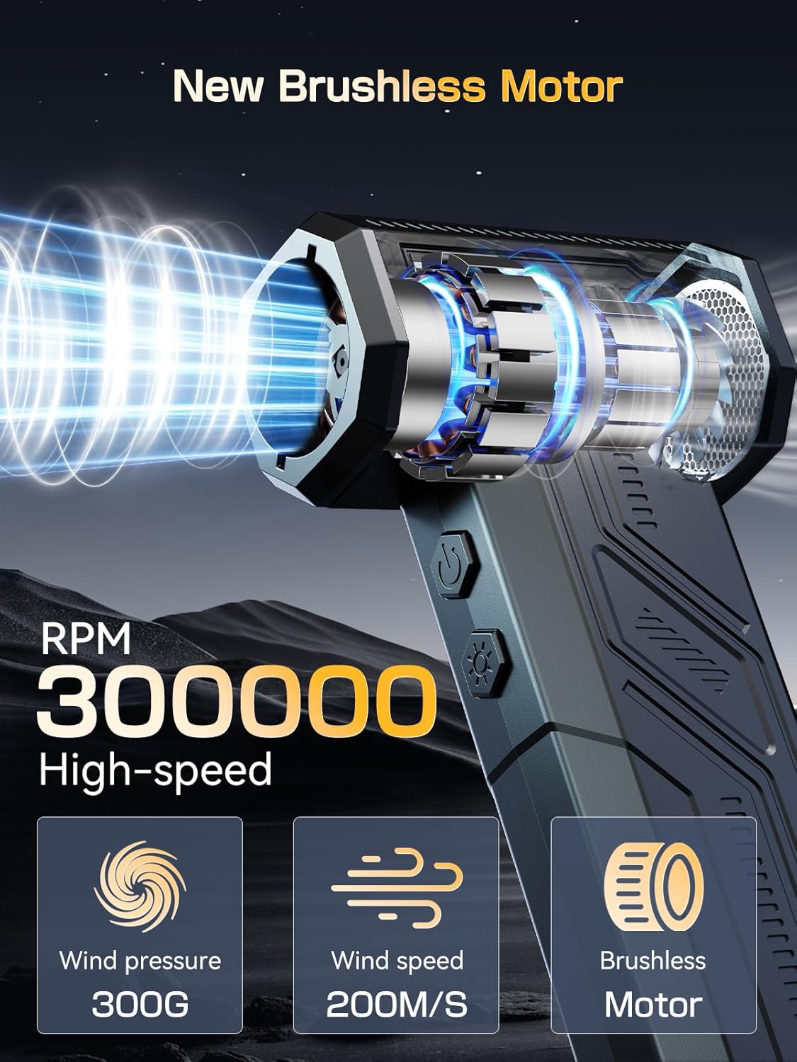 - High-Speed Performance: The electric air duster boasts an impressive 300,000 RPM, delivering powerful airflow for efficient dust and debris removal, making it ideal for cleaning electronics, home, and car interiors.