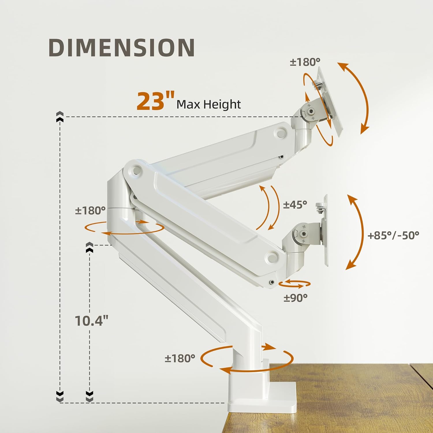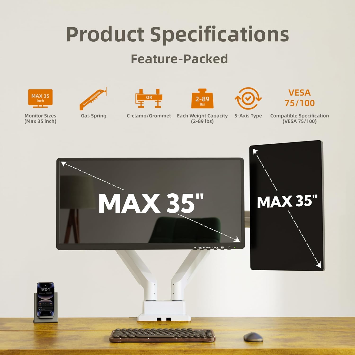 Claiks Dual Monitor Mount for Max 35 inch Screens Stand up to Max 89 lbs, Ergonomic Gas Spring Heavy-Duty Adjustable Monitor Arm, with Clamp and Grommet Base, VESA Mounting Holes 75&100mm, White