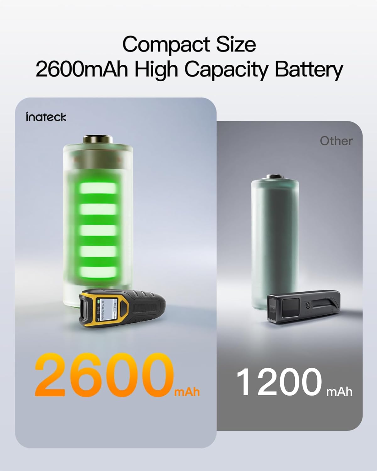 - 2600mAh High Capacity Battery: The Inateck wireless portable barcode scanner features a 2600mAh high capacity battery that supports up to one week of continuous use with low charging frequency. Its battery capacity is twice that of most portable scanners, offering greater convenience and peace of mind during use