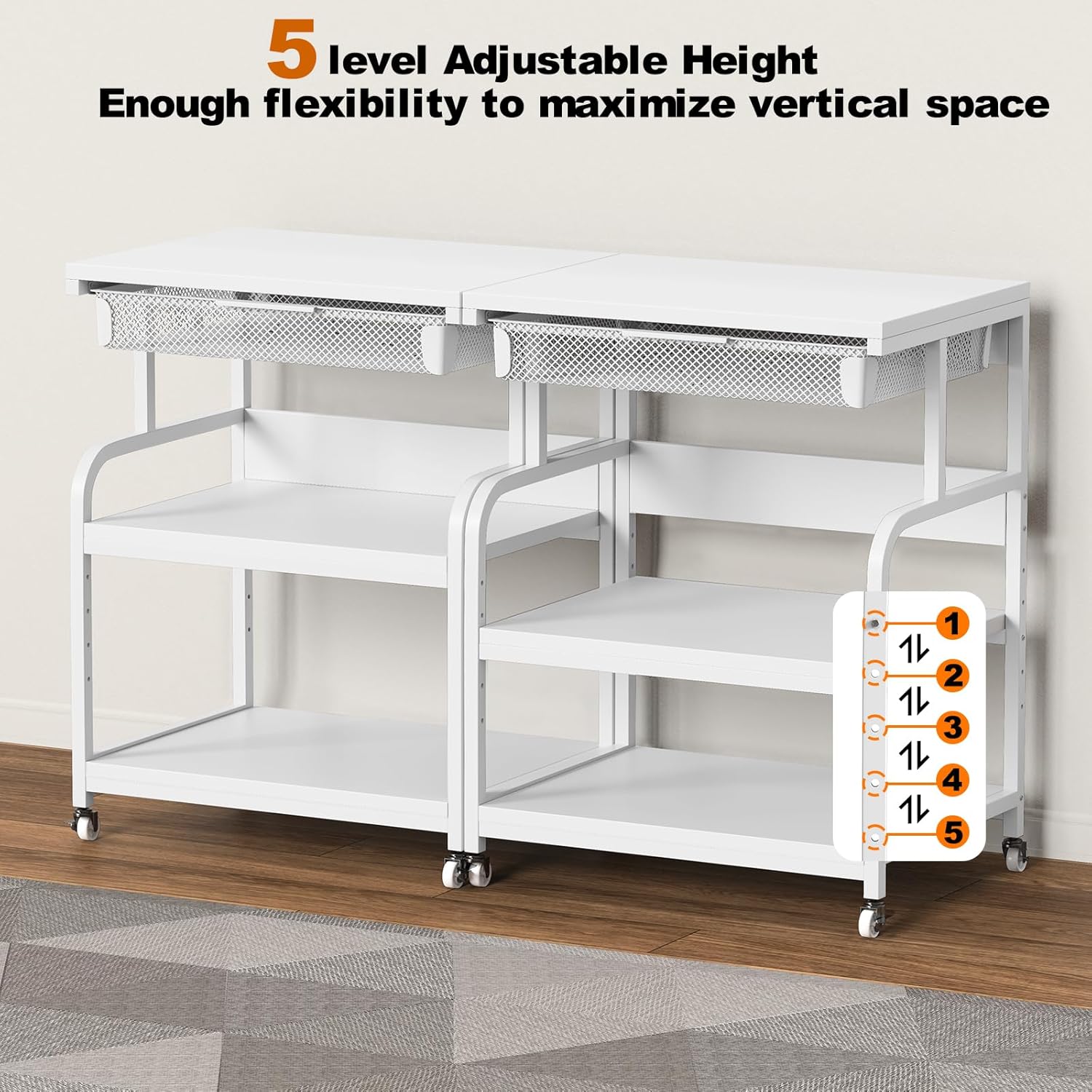 - 5 Adjustable Heights: The printer stand has five adjustable heights to accommodate your different printer size types.Conveniently storing multiple printers,faxes, making full use of vertical space to efficiently organize and store your items.
