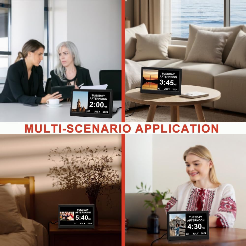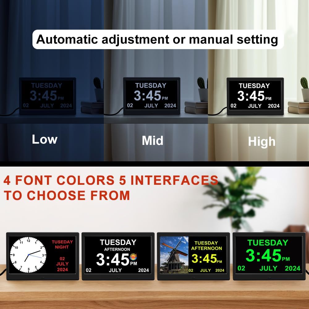 Alarm Clock with Day and Date for Elderly Digital Calendar Clock Photo Frame- Auto Dimmable Display 15 Alarm Options (10 Inch Black)