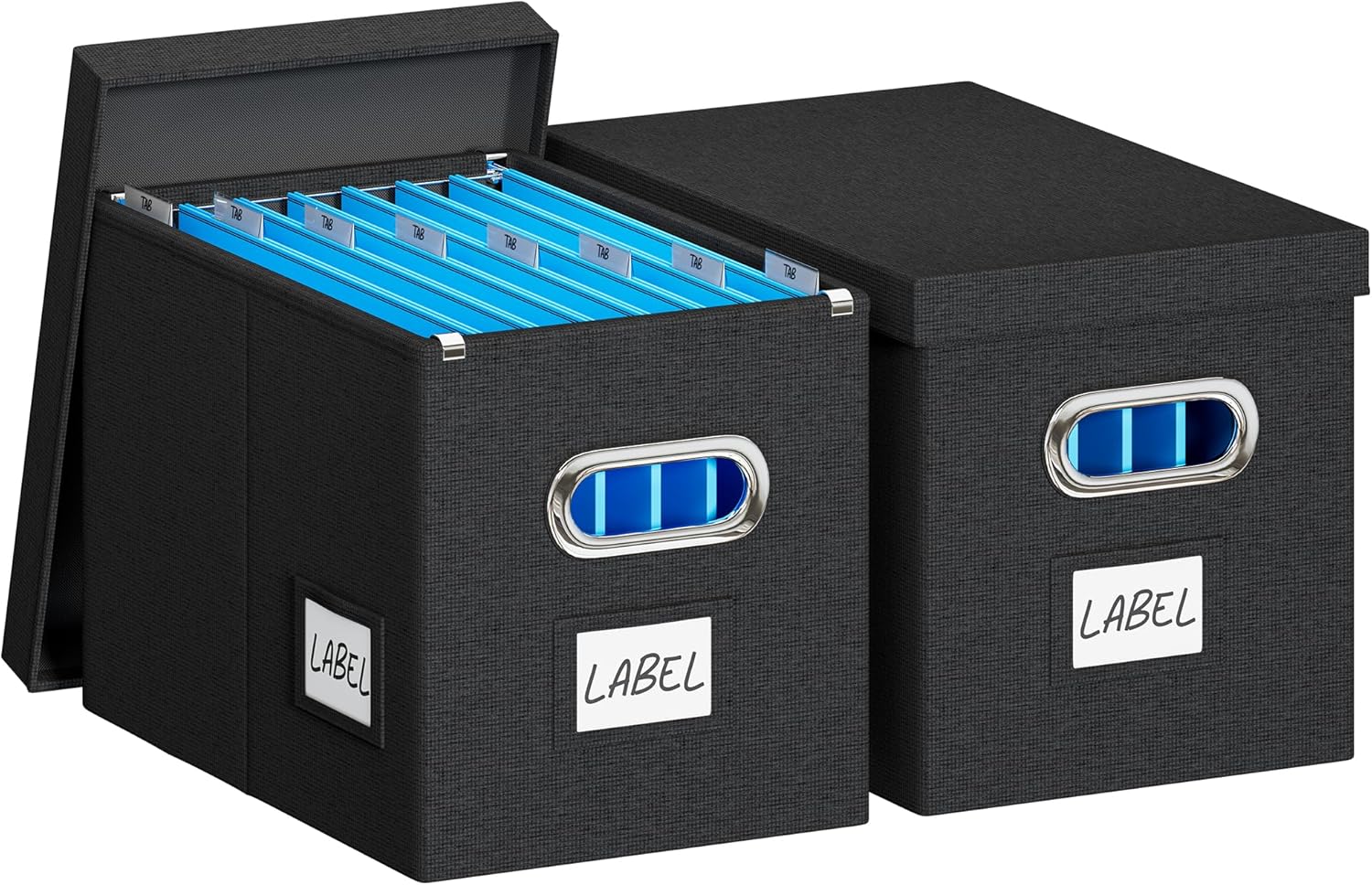 File Organizer Box with Lid - Set of 2 Portable Hanging File Box, Collapsible Linen Decorative Filing Storage Boxes for Office & Home File Cabinet (Black 14 x 9.3 x 10.9 inch)