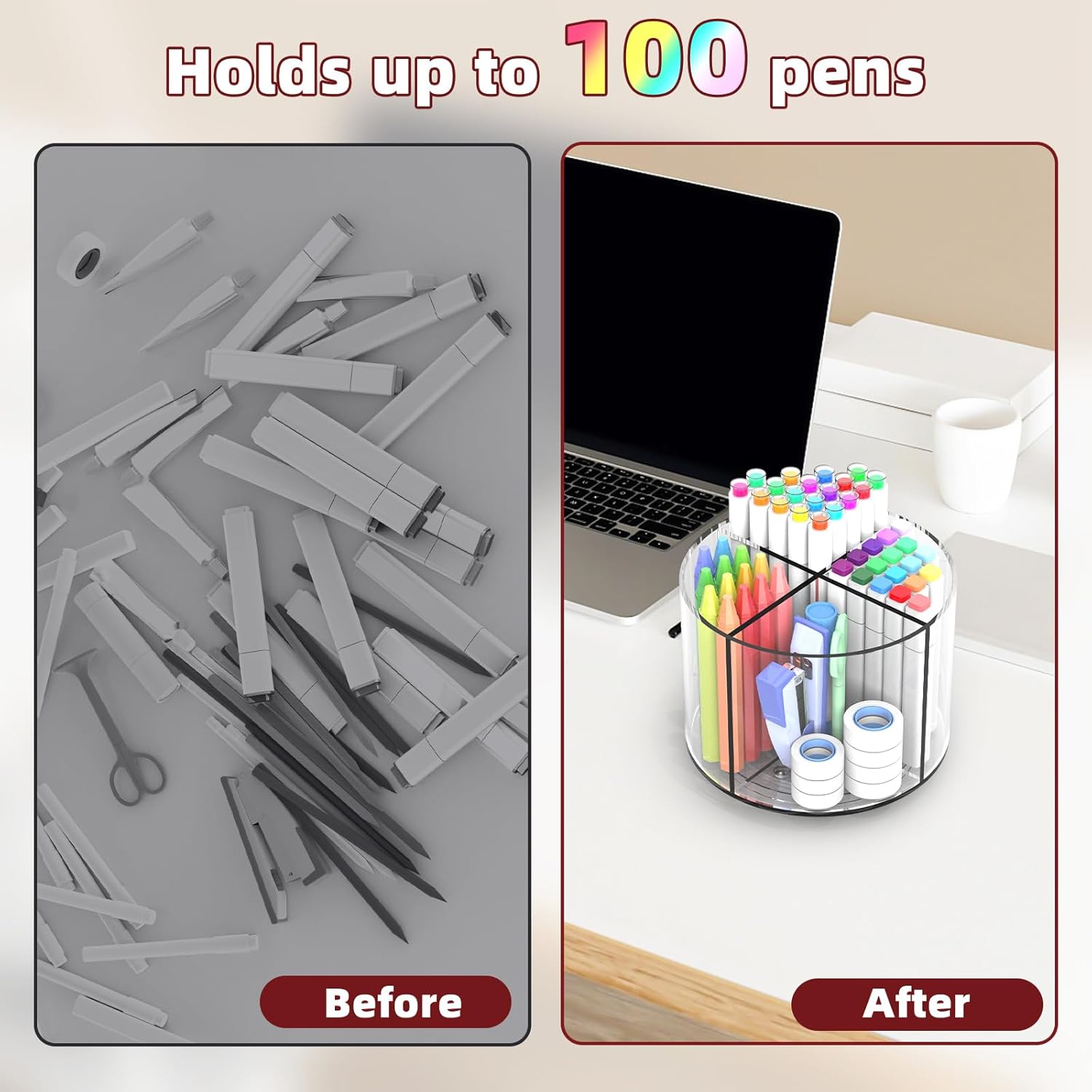 - 4 Compartments Storage Capacity - Don't let its slim profile fool you! The acrylic pen holder features multiple compartments and slots, providing ample storage space for all your writing essentials. Say goodbye to desk clutter and hello to organized efficiency.360 degree rotation function pencil holder for desk is not only perfect for sorting pens, pencils, color pens, crayons, markers, art supplies tools, makeup brush, etc.