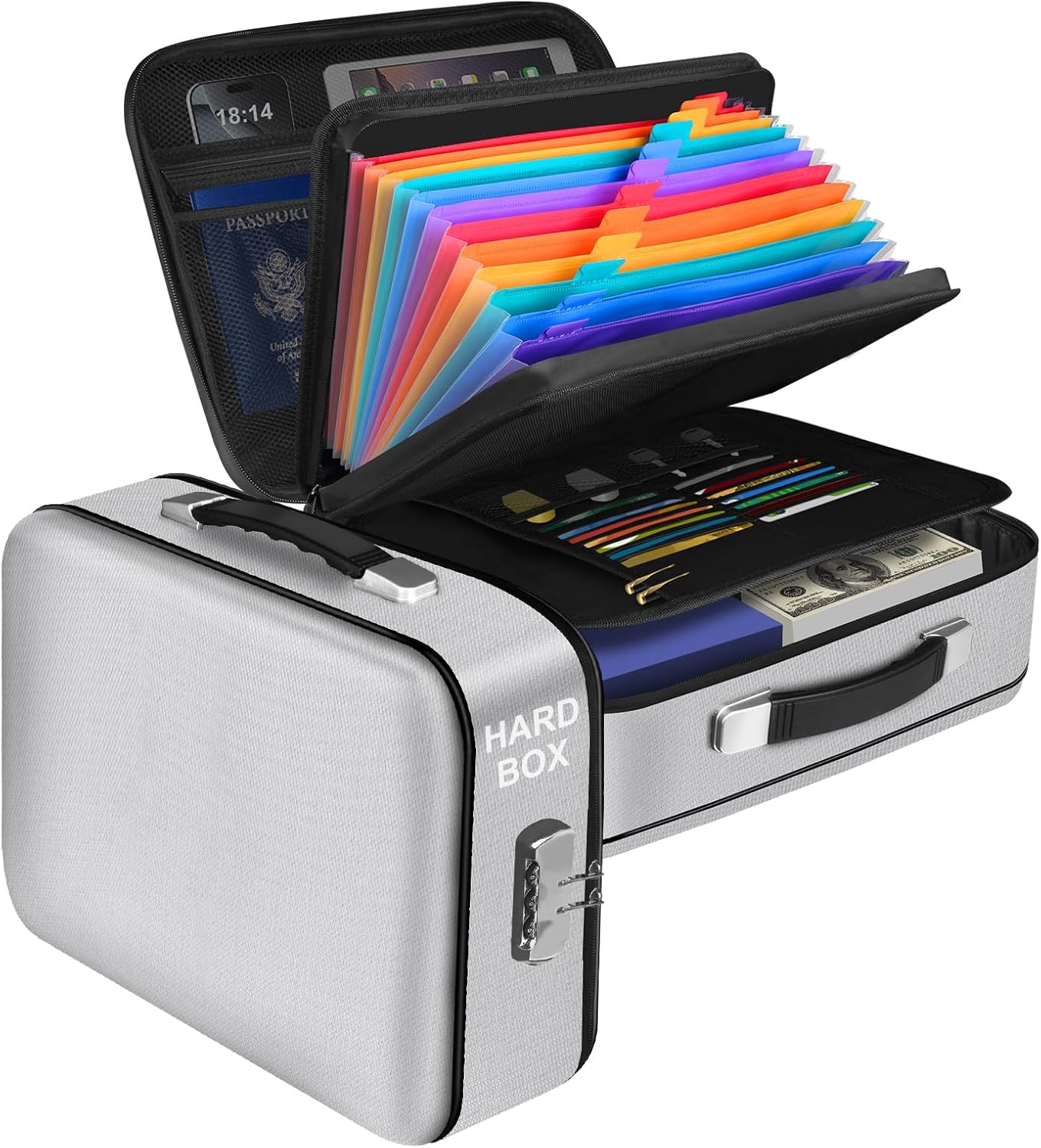 Fireproof Document Box, Hard Shell Fireproof Box, Document Organizer with Lock, Fireproof Water Resistant box, Portable Documents Safe Box for Important Document Certificates, Laptop, Passports,Silver