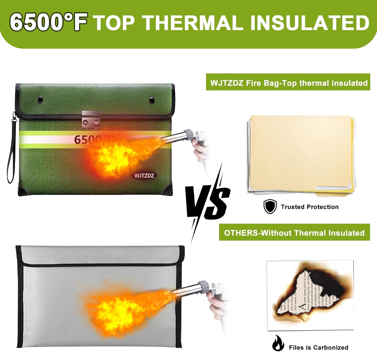 - ⚠️(Note) Fireproof does not mean it can withstand a long fire, and waterproof does not mean it can be immersed in water for a long time.It just gives you enough time to rescue your valuables. 🔥【6500°F Top Fireproof】The upgraded fireproof bag has passed the global flammability standard (US laboratory) and vertical burning test (SGS UL94 V-1) and can withstand temperatures up to 6500°F, far exceeding the typical fire temperature.