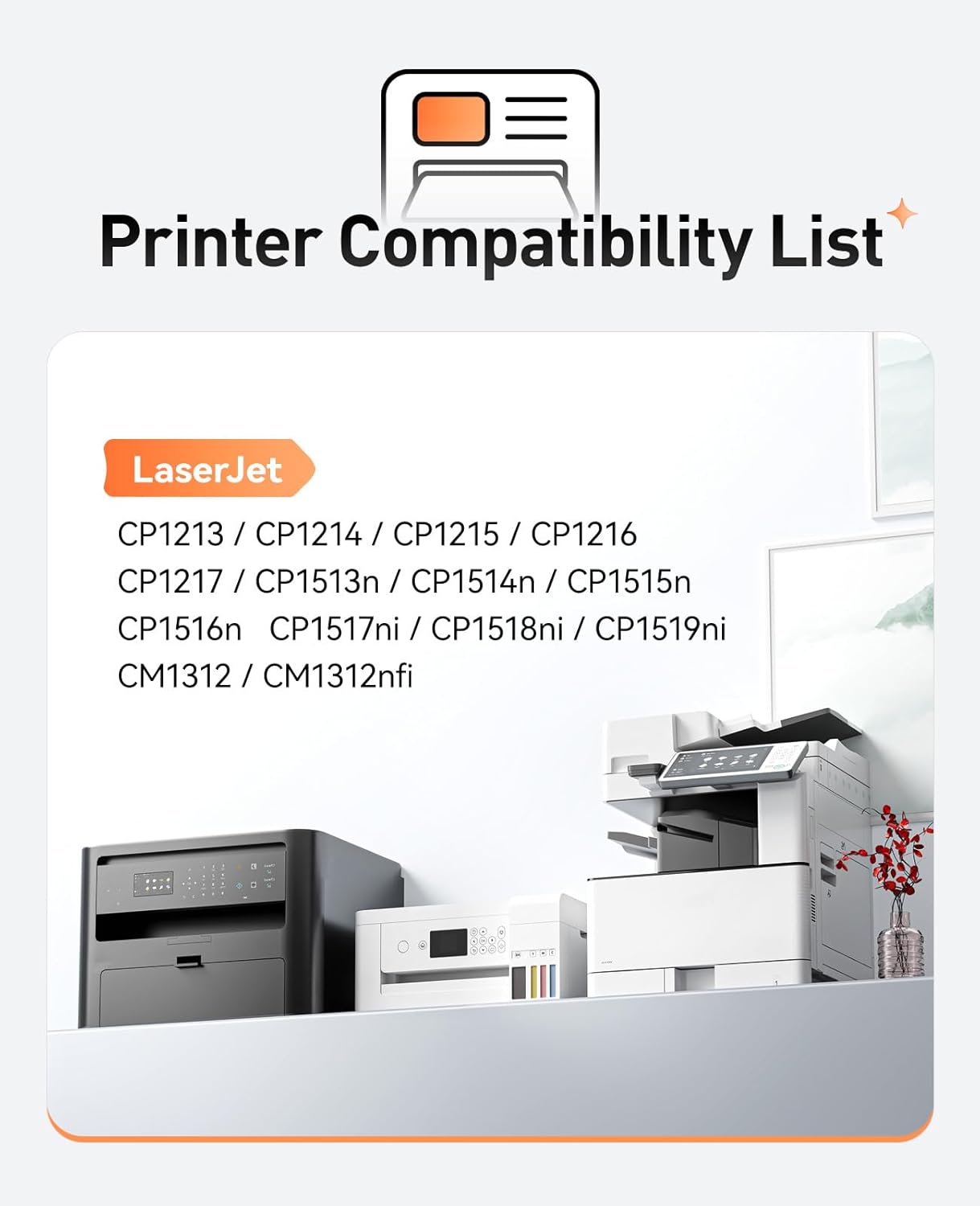 - Compatible Printer: Compatible with HP Color LaserJet CP1213 CP1214 CP1215 CP1216 CP1217 CP1513n CP1514n CP1515n CP1516n CP1517ni CP1518ni CP1519ni CM1312 CM1312nfi Printer.