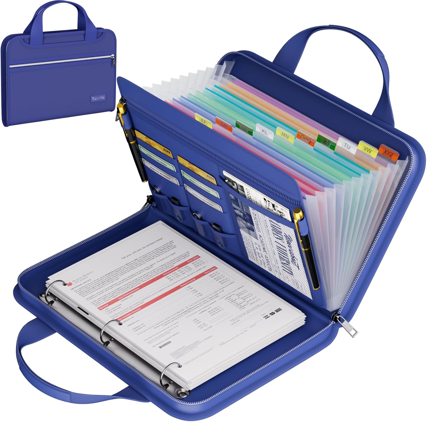 Fireproof Accordion File Organizer with Handle, 13 Pocket Expanding File Folder with Zipper & Labels, File Folder with 3 Ring Binder, Multi Pockets Paper Organizer Folder for Letter A4 Files (Blue)
