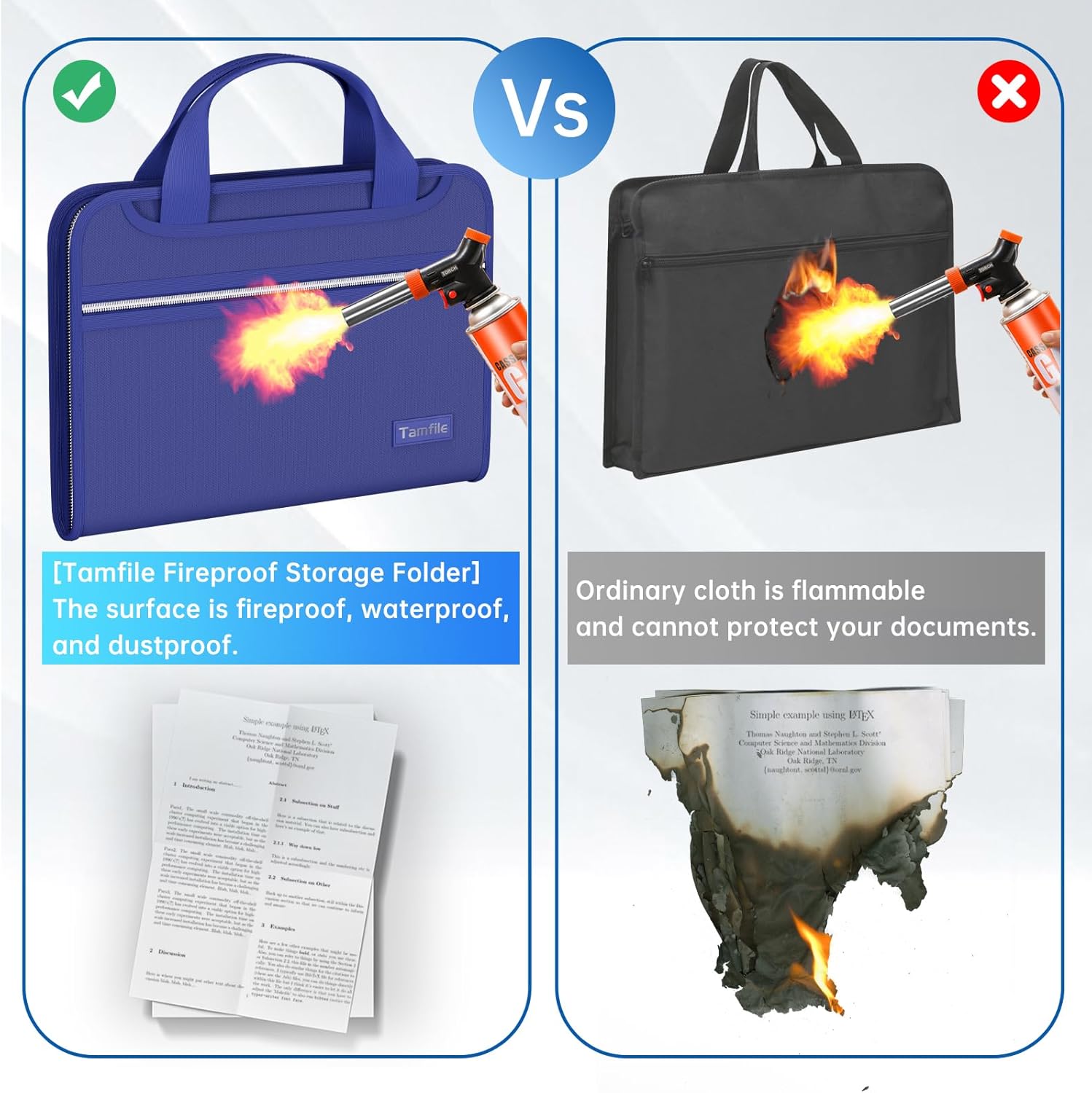 - Tamfile Fireproof Storage Folder: Fireproof, Waterproof, Dustproof. The folder surface is made of upgraded silicone glass fiber fabric with fireproof and waterproof properties, capable of withstanding temperatures up to 2200°F and passing SGS testing (UL94 certification).Fireproof multifunctional folders are suitable for storing and organizing your valuable materials certificates, birth certificates, important documents, office supplies, picture albums, drafts, etc.