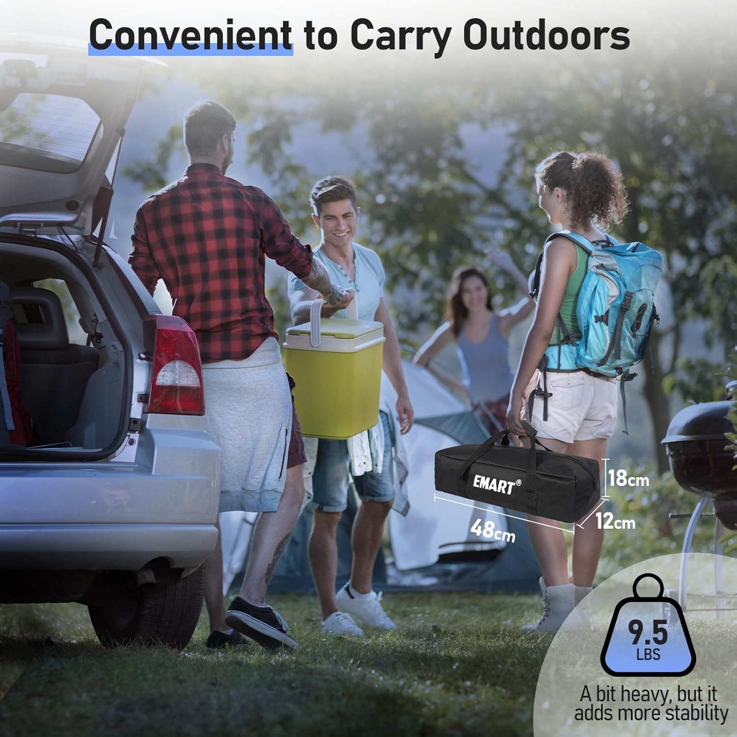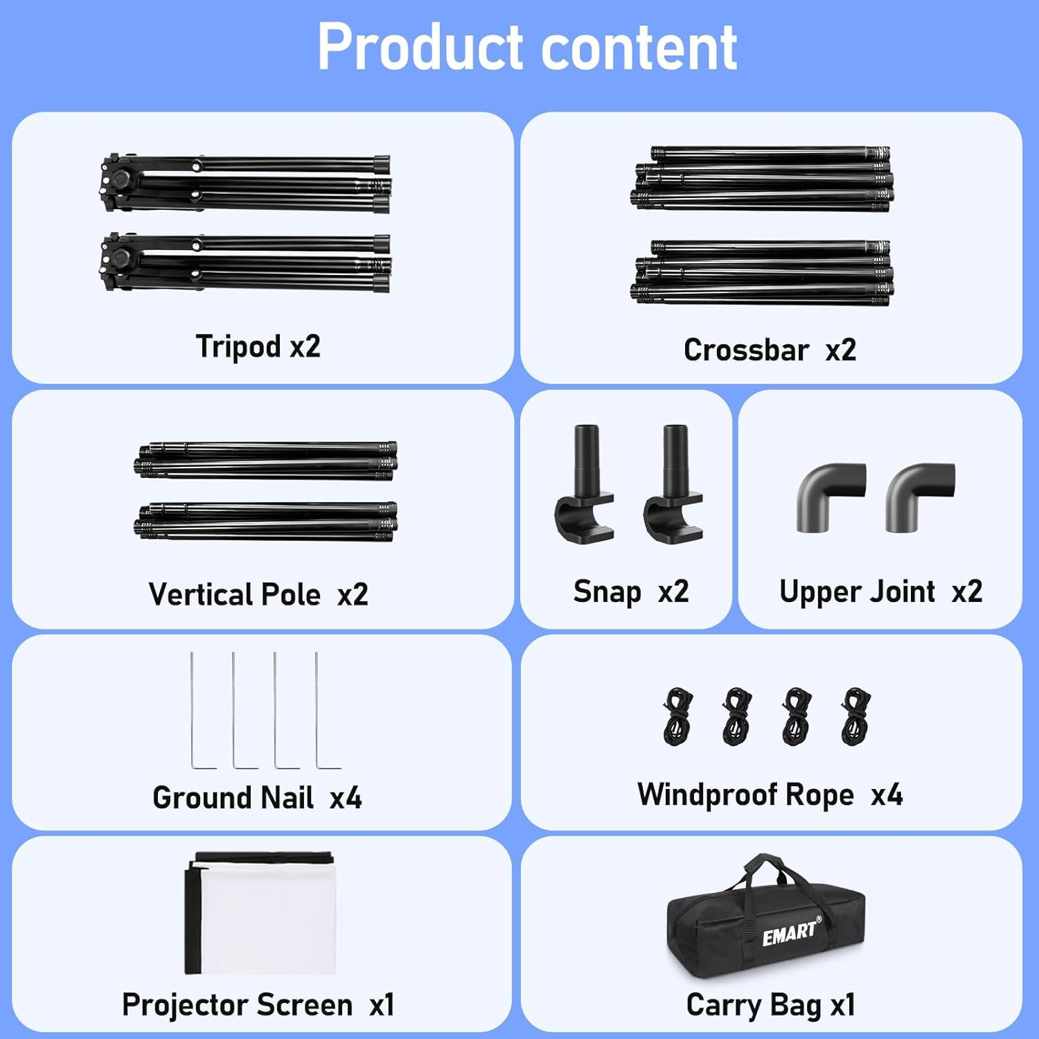 - 【Super Value Accessories】The projector screen stand set includes a carrying bag, making it easy to transport anywhere for family trips, camping, or backyard movie nights. Equipped with ground stakes and wind-resistant ropes, you can use it outdoors without any worries