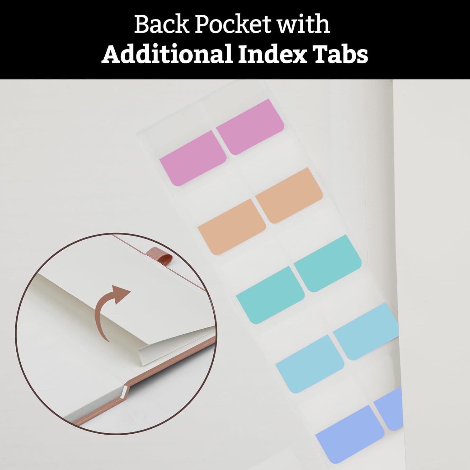 - Bonus Tabs: 1 sheet (12 index tabs) in the pocket—easy to apply/remove without damaging paper.