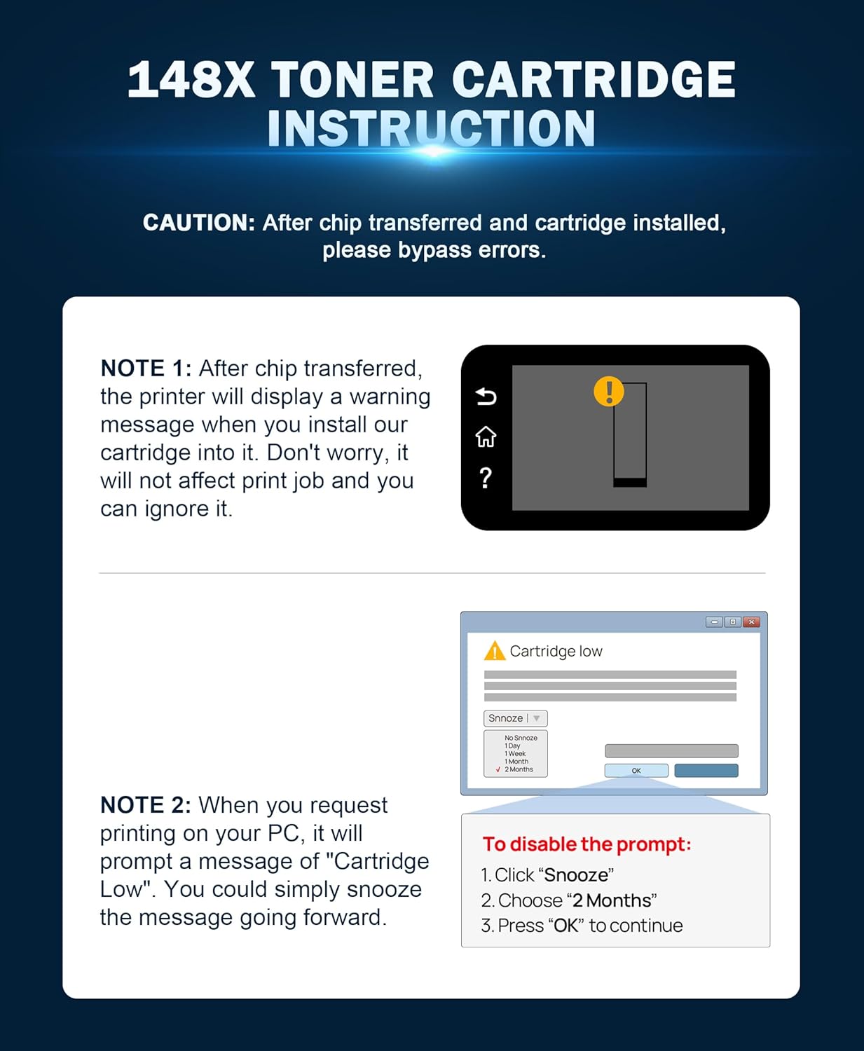 - 💖Warm Tip: You may receive error message such as "Cartridge Low" or "Used or Counterfeit Toner Cartridge Install" during printing. It would not affect printing, please ignore it or click OK and continue to use toner.