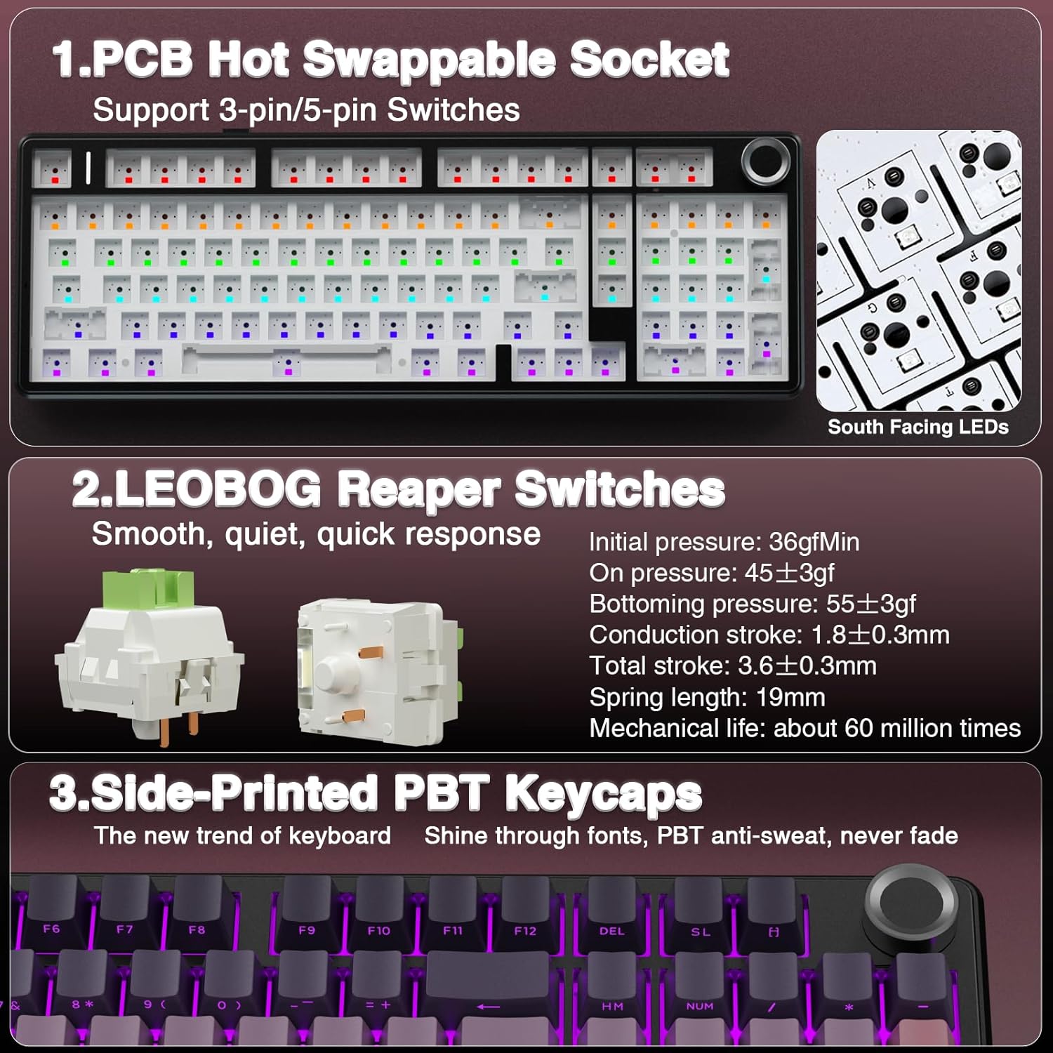 - Hot-swappable Custom Keyboard: The switches and keycaps can be freely replaced(keycap/switch puller are included in the package).This customizable keyboard with hot-swap PCB allows users to replace 3 pins/5 pins switches easily without soldering issue. F99 Pro mechanical keyboards equipped with pre-lubed linear switches, bring smooth typing feeling and pleasant typing sound, provide fast response for exciting game