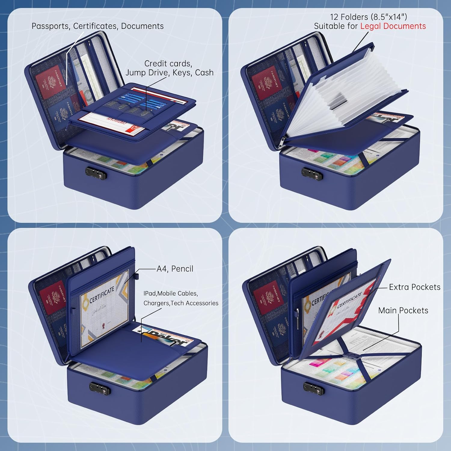 - 4-Layer Categorized Storage and Upgrade Size: Our 17"x 12"x 5.3" fireproof document bag has 4 levels of categorized storage space. Compare to other bag, we upgraded larger size, can hold more documents. 12 folder pages for document of legal document size and below. The internal compartment of the important document organizer is removable HOOK&LOOP design. Can store passports, legal documents, A4 papers, certificates, ID cards, credit cards, cash, chargers, electronic accessories, etc