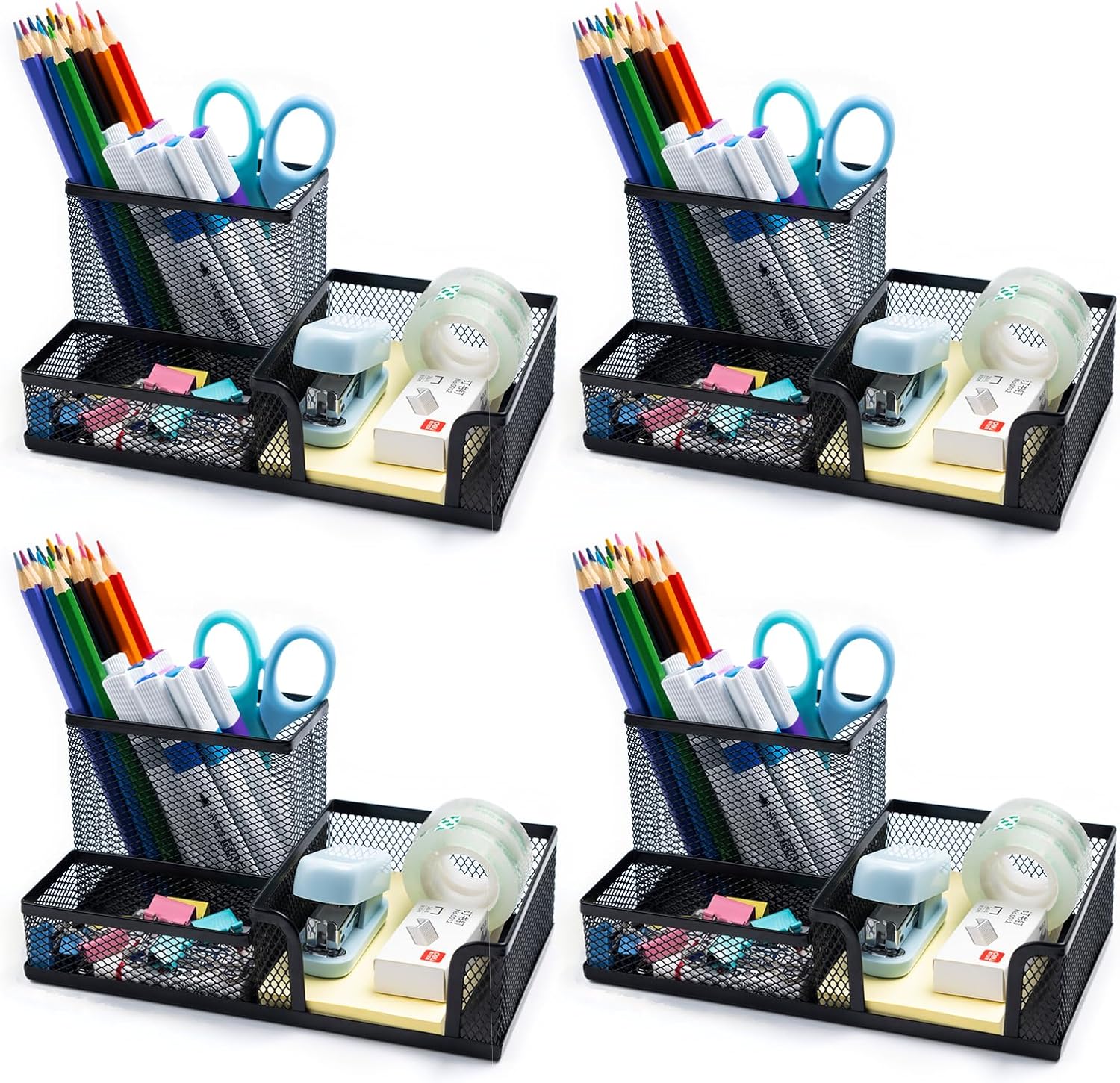 4 Pieces Mesh Pen Holder Desk Organizers and Accessories for Deskop Organizer,3 Compartments Black Pencil Holder for Office Supplies,Gifts for Colleague