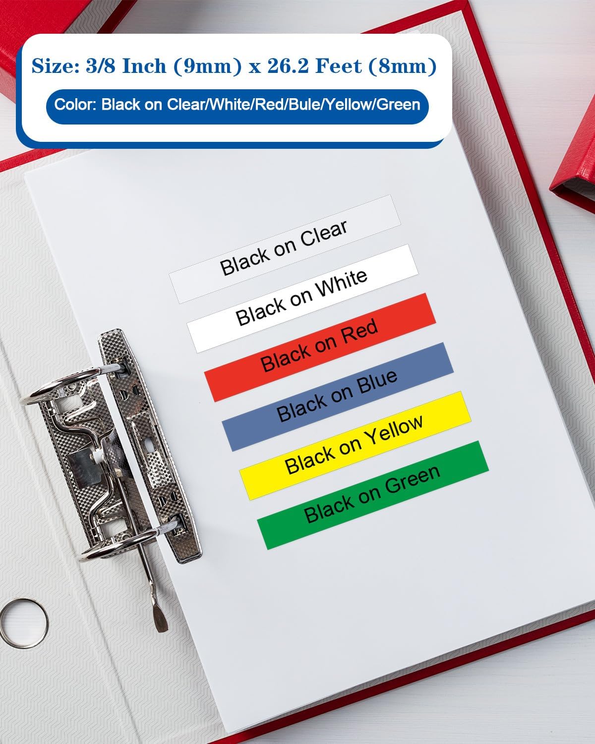 6-Pack TZe TZ Tape 9mm 0.35" Laminated Colored Compatible for Brother P Touch Label Tape 3/8 Inch for PT-D210 D220 H110 D400 Label Maker, Clear/White/Red/Blue/Yellow/Green