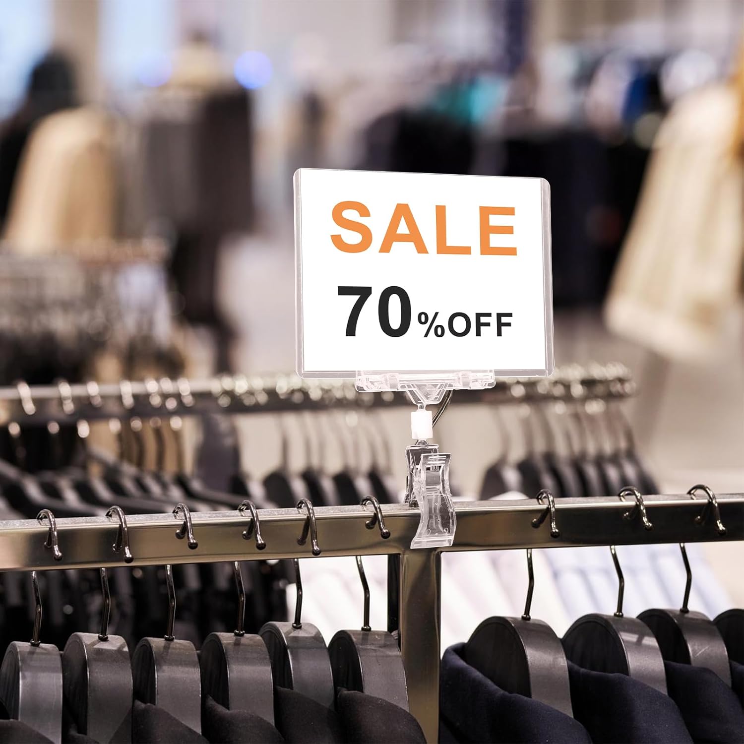 - Pop Clip Sign Holder: these merchandise sign clip is made from PC, strong clamping force, and can be fixed to the rack or shelf, rugged, reliable and easy to clean; In addition, tag clip is flexible and can be 90 degree or 360 degree bending and rotating logo to achieve complete display