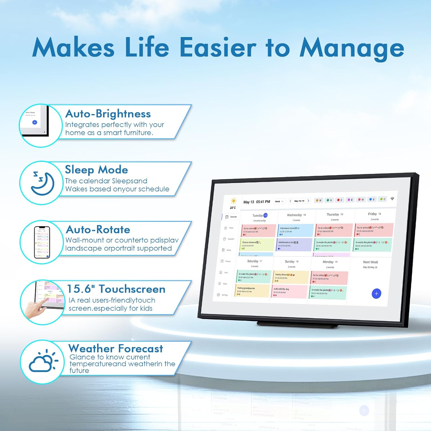 - ❤Seamless Scheduling: Smart digital calendar, effortlessly create and manage events, appointments, and reminders. with just a few clicks. Our 15.6" Full HD touchscreen intuitive interface makes scheduling a breeze, whether it’s a crucial meeting or a family gathering. The perfect gift for mom who keeps everyone organized.