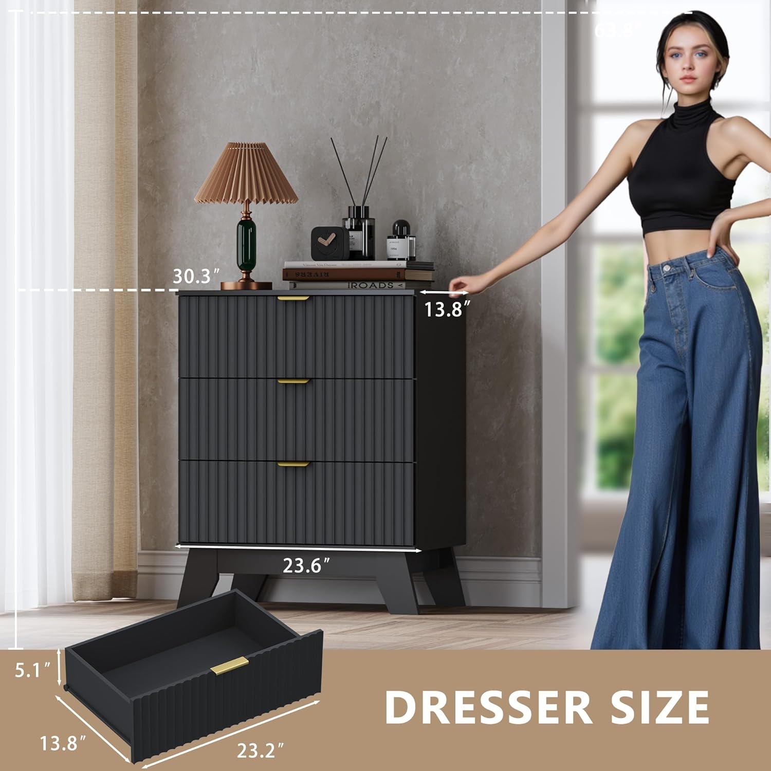 Fluted 3 Drawer Dresser, 30.3" Tall Compact Modern Boho Chest of Drawers, Wooden Storage Cabinet for Bedroom, Living Room, Entryway, Curved Profile Design